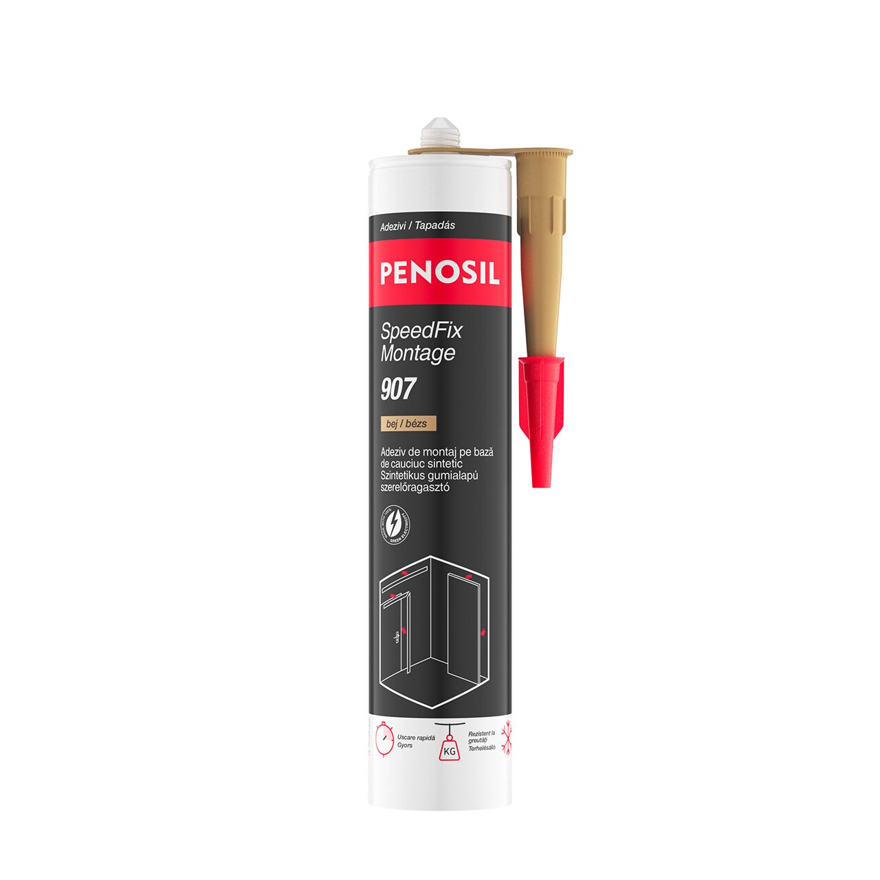 Testați aderența pe substrat înainte de utilizare pentru a vă asigura că produsul este adecvat pentru lucrarea dorită. Tăiaţi capătul cartuşului deasupra filetului. Înşurubaţi strâns vârful cartuşului. Tăiaţi vârful la un unghi de 45° corespunzător lăţimii rostului. Montaţi cartuşul cu duza în pistol şi umpleţi duza cu material, apăsând mecanismul tip trăgaci al pistolului. Pentru evitarea murdăririi rostului de montaj, lipiţi banda de mascare înainte de instalarea elementelor. Înlăturaţi banda înainte de uscarea definitivă a adezivului. Adezivul SpeedFix Montage 907 se poate utiliza atât pentru lipirea de contact, cât şi pentru lipirea umedă unilaterală. Aderență imediată 20".