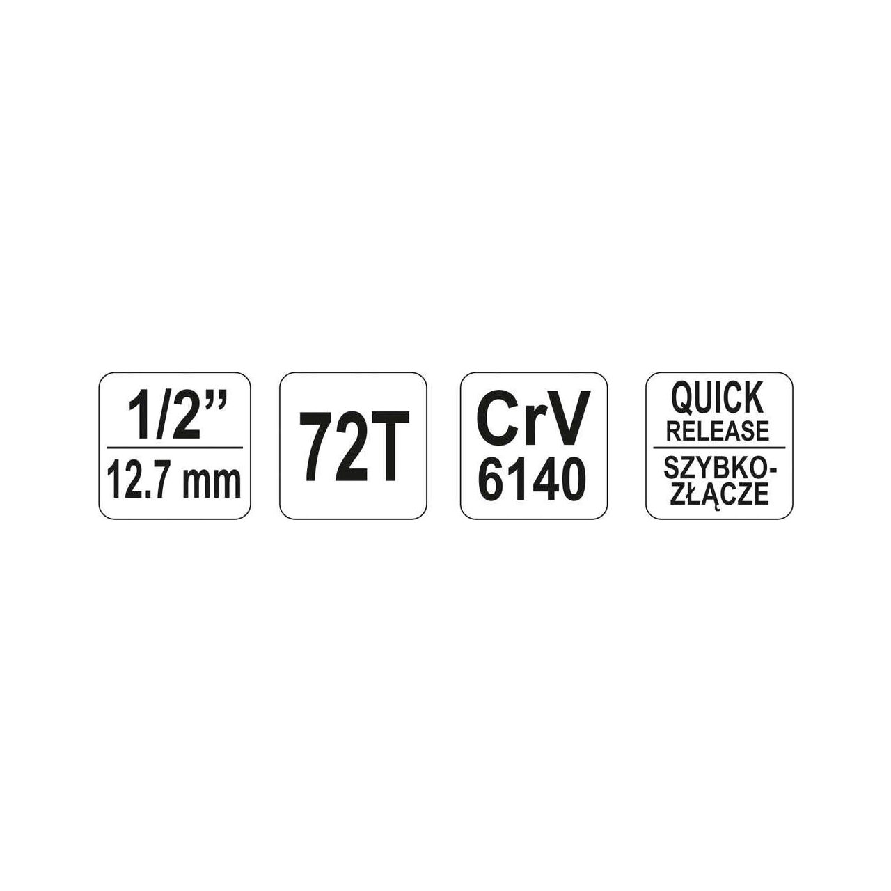 Caracteristici produsClichet îndoit la prize de 1/2 ", lungime 255 mm. Clichetul este fabricat din oțel crom vanadiu CrV6140. Clichetul este echipat cu sistemul QUICK RELASE și un mecanism cu 72 de dinți. Cursa minimă de lucru este de 5 °Domenii utilizarecerere pentru service, atelier și lucrări industrialeParametrii- Mâner: curbat