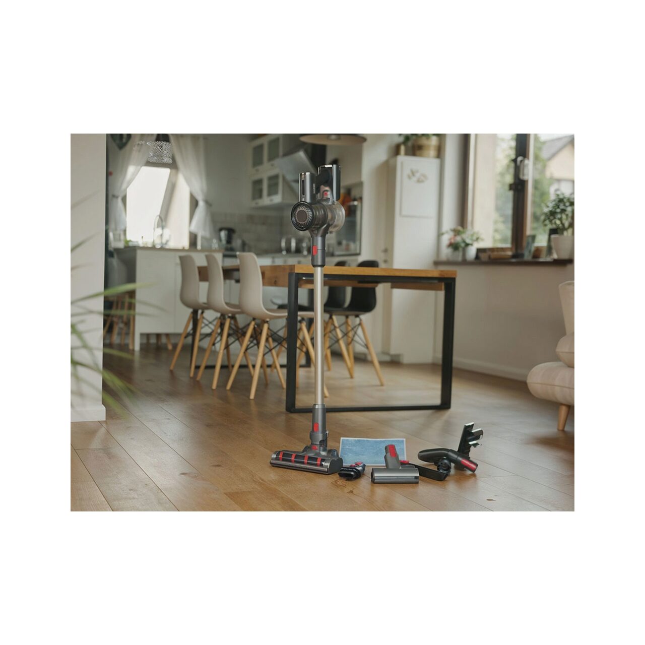 - Eficiență – un motor puternic fără perii de 200 W, o perie turbo alimentată electric și tehnologia ciclon garantează o putere de aspirare mare de 20 kPa și, prin urmare, o aspirare eficientă