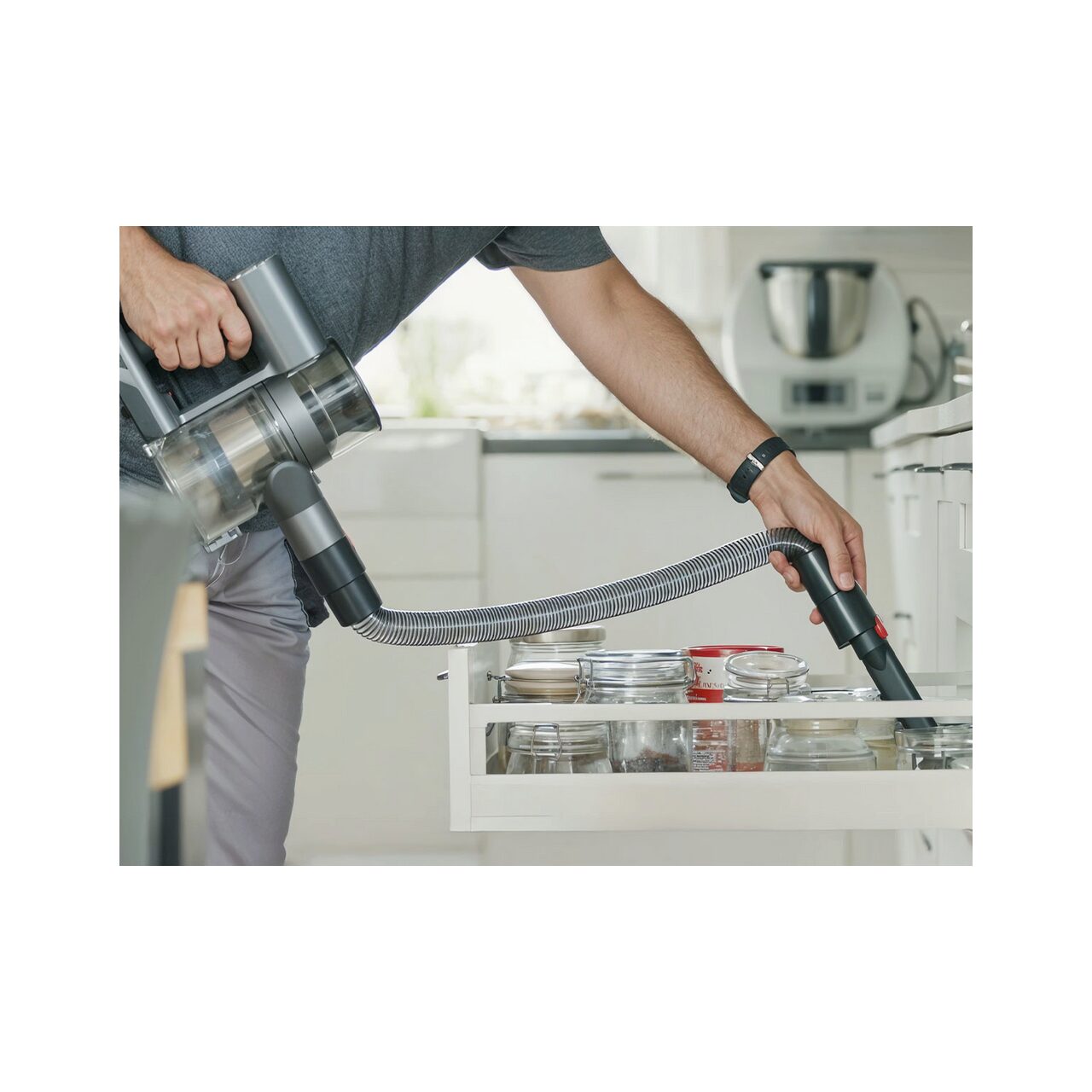- Tubul flexibil de 44-130 cm cu duză conectată facilitează aspirarea precisă a locurilor greu accesibile, de ex. în sertare, în spatele canapelei sau în mașină