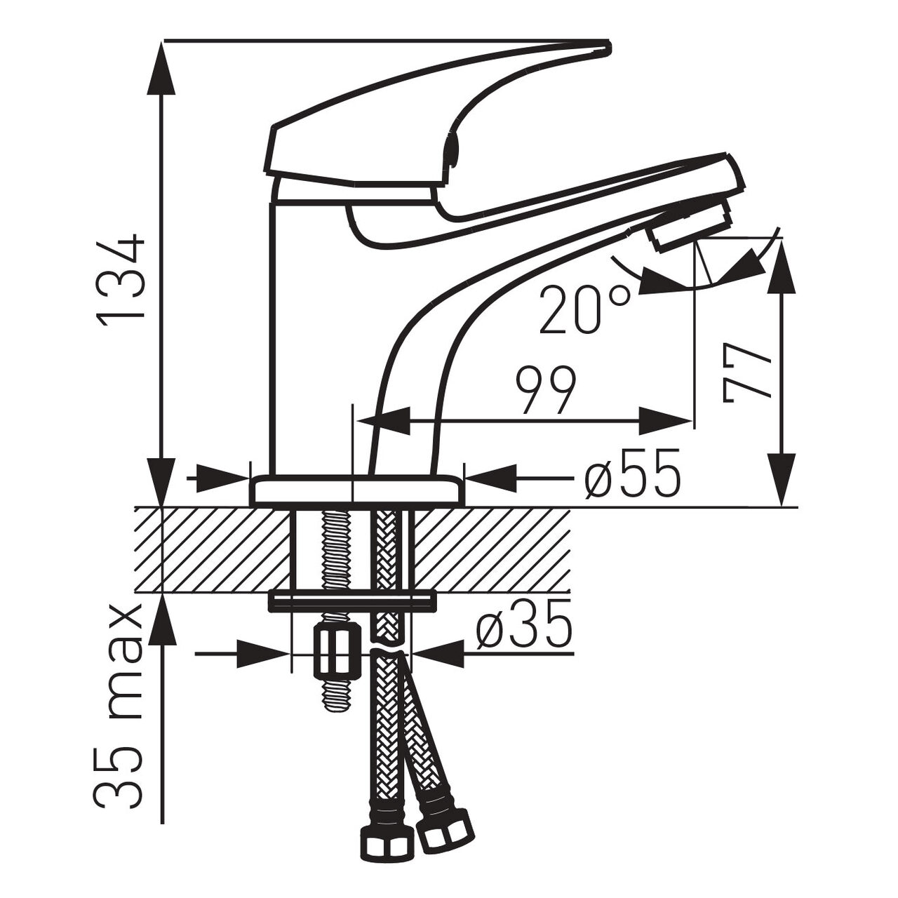Concepută pentru echilibru între confort și consum, această baterie oferă un debit controlat la 1,6 l/min indiferent de presiunea dinamică, susținând gestionarea eficientă a apei. Sistemul de economisire a apei împreună cu aeratorul M24x1 Easy Clean livrează un jet liniar aerat, plăcut și stabil, cu stropire redusă și întreținere rapidă. Corpul din alamă și cartușul ceramic cu acționare precisă asigură fiabilitate în utilizarea de zi cu zi și mențin o reglare predictibilă a temperaturii și a debitului. Dimensiunile echilibrate, cu înălțimea bateriei de 134 mm, înălțimea de evacuare de 77 mm și lungimea pipei de 99 mm, facilitează integrarea pe lavoare compacte sau standard. Racordurile flexibile G3/8 - M10x1 simplifică montajul, iar ventilul de scurgere click-clack G5/5 oferă o acționare intuitivă pentru închiderea și deschiderea evacuării.
