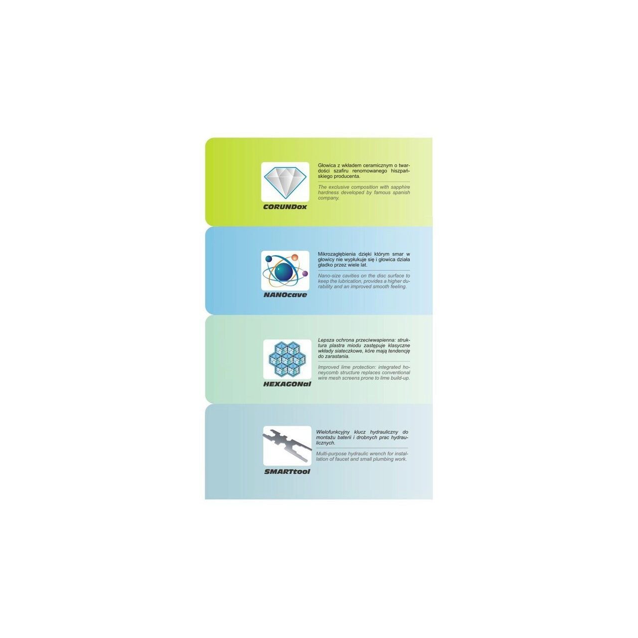 Mixerul de baie Burgos este o combinație unică a unui stil modern de corp cromat, solid, din alamă, cu componente de înaltă calitate și tehnologii unice: CORUNDox - un cap cu o inserție ceramică cu o duritate safir a unui renumit producător spaniol (Sedal) NANOcave - micro-cavități, datorită cărora grăsimea din cap nu este spălată și capul funcționează lin timp de mulți ani HEXAGONal - protecție mai bună împotriva calcarului : structura fagure de miere înlocuiește inserțiile clasice din plasă, care tind să crească prea mult SMARTtool - multifuncțional hidraulic cheiepentru montarea bateriei și a lucrărilor mici de instalații sanitare Robinetul are un cap de la un renumit producător spaniol (Sedal) echipat cu un sinter ceramic CORUNDox cu duritate safir cu depresiuni microscopice pe suprafața NANOcave , care protejează grăsimea de spălare.