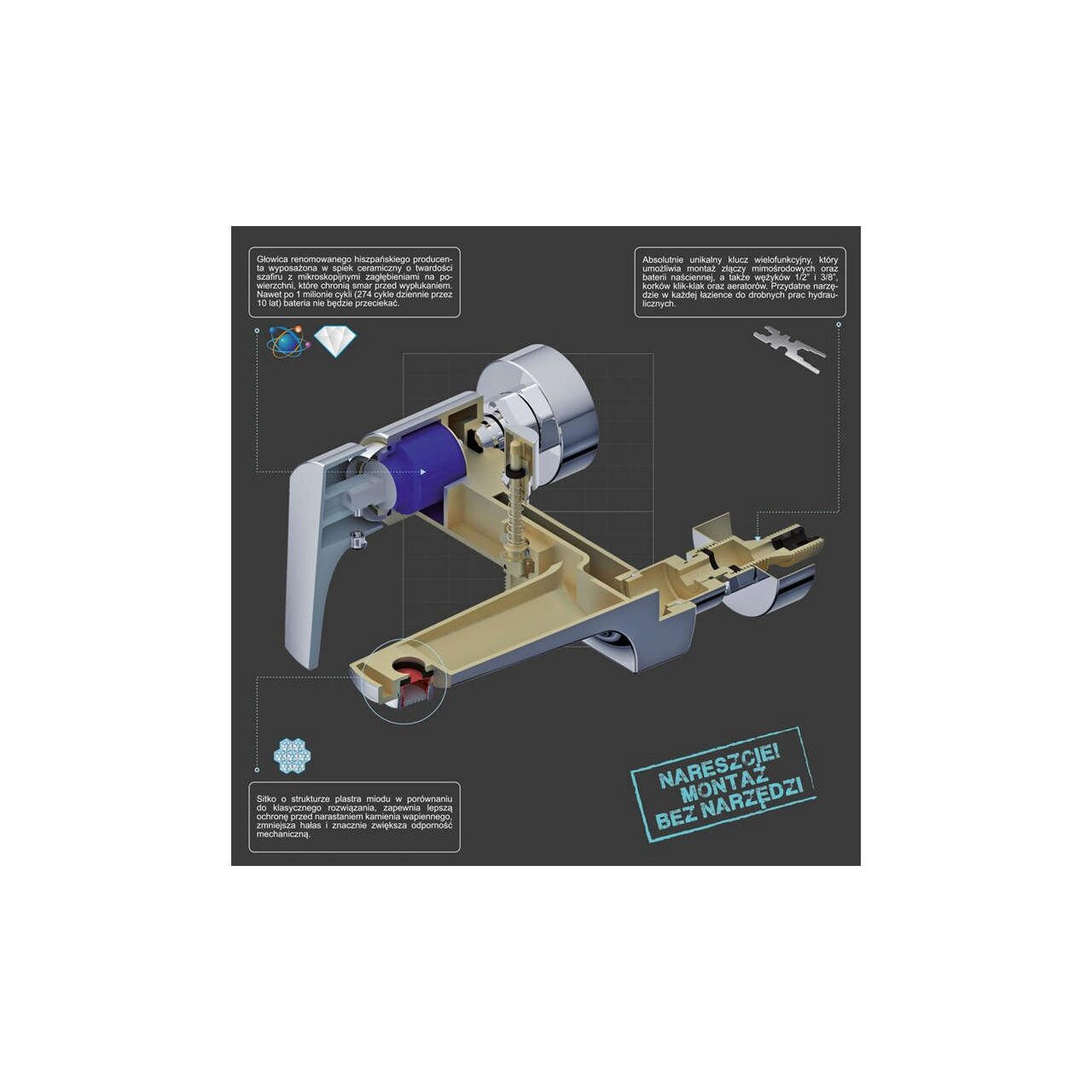 Mixerul de cadă Murcia este o combinație unică a unui stil modern de corp cromat, solid, din alamă, cu componente de înaltă calitate și tehnologii unice: CORUNDox - un cap cu inserție ceramică cu o duritate safir a unui renumit producător spaniol (Sedal) NANOcave - micro-cavități, datorită cărora grăsimea din cap nu este spălată și capul funcționează lin timp de mulți ani HEXAGONal - protecție mai bună împotriva calcarului : structura fagure de miere înlocuiește inserțiile clasice din plasă, care tind să crească prea mult SMARTtool - multifuncțional hidraulic cheiepentru montarea bateriei și a lucrărilor mici de instalații sanitare Robinetul are un cap de la un renumit producător spaniol (Sedal) echipat cu un sinter ceramic CORUNDox cu duritate safir cu depresiuni microscopice pe suprafața NANOcave , care protejează grăsimea de spălare.