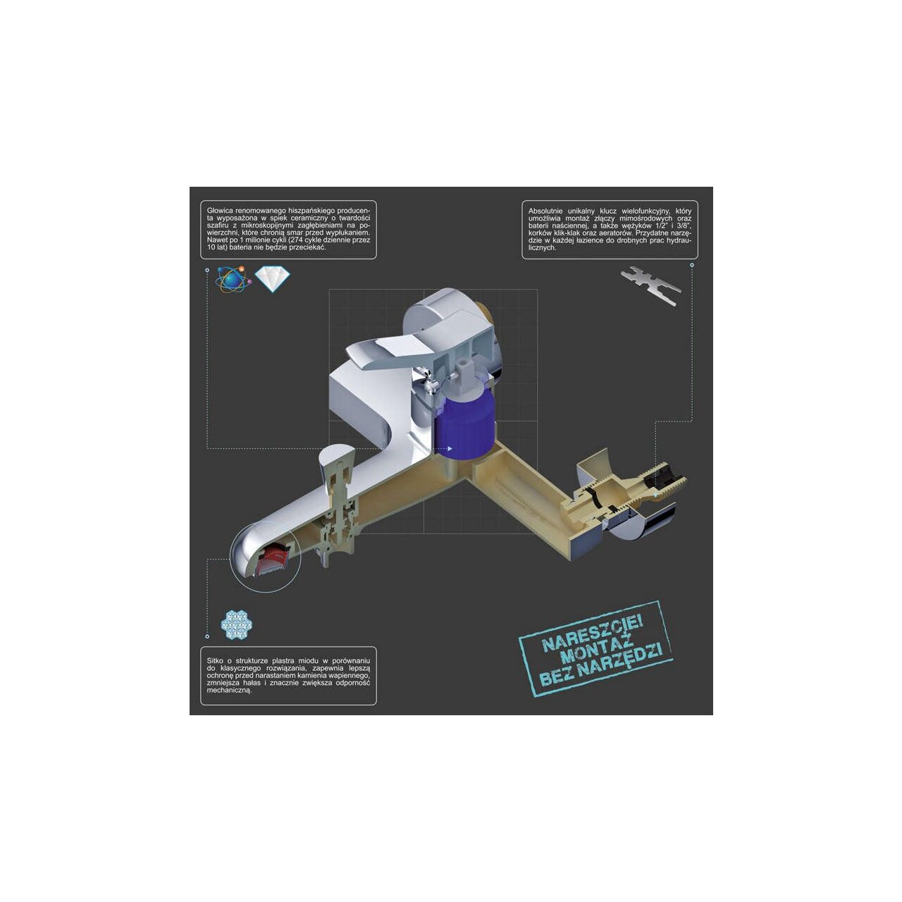 Mixerul pentru cadă Soria este o combinație unică a unui stil modern de corp crom, solid, din alamă, cu componente de înaltă calitate și tehnologii unice: CORUNDox - un cap cu inserție ceramică cu o duritate safir a unui renumit producător spaniol (Sedal) NANOcave - micro -cavuri datorită cărora grăsimea din cap nu este spălată și capul funcționează lin timp de mulți ani HEXAGONal - protecție anti - calcar mai bună : structura fagure de miere înlocuiește inserțiile clasice din plasă, care tind să crească SMARTtool - cheie hidraulică multifuncționalăpentru montarea bateriei și a lucrărilor mici de instalații sanitare Robinetul are un cap de la un renumit producător spaniol (Sedal) echipat cu un sinter ceramic CORUNDox cu duritate safir cu depresiuni microscopice pe suprafața NANOcave , care protejează grăsimea de spălare.