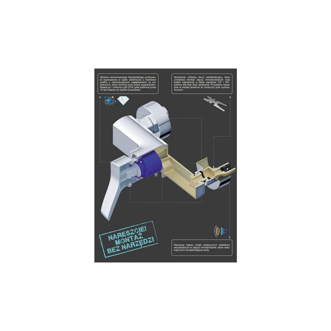 Caracteristici produsBateria de duș Soria este o combinație unică a unui stil modern de corp crom, solid, din alamă, cu componente de înaltă calitate și tehnologii unice: CORUNDox - un cap cu o inserție ceramică cu o duritate safir a unui renumit producător spaniol (Sedal) NANOcave - eficient zgomot redus datorită utilizării amortizoarelor de zgomot în conectorii LOWnoise - o protecție mai bună la calcar : structura fagure de miere înlocuiește inserțiile clasice din plasă, care tind să crească SMARTtool - cheie hidraulică multifuncțională pentru montarea bateriilor și a instalațiilor sanitare minoreBateria are un cap de la un renumit producător spaniol (Sedal) echipat cu un sinter ceramic CORUNDox cu o duritate safir cu depresiuni microscopice pe suprafața NANOcave , care protejează grăsimea de spălare. Tăietoarele de zgomot LOWnoise sunt încorporate în articulațiile excentrice , care reduc efectiv zgomotul apei curgătoare. Robinetul este echipat cu o cheie hidraulică multifuncțională SMARTtool , pe care o puteți utiliza pentru a instala robinetul, pentru a deservi aeratorul și pentru lucrările de instalații sanitare minore. Moda se schimbă și garanția va dura - o garanție de 10 ani etanșeitatea nu numai a corpului în sine, ci și a capului. Conținutul pachetului- robinet - 2 îmbinări excentrice cu garnituri - 2 rozete decorative - un instrument care facilitează instalarea came și baterii, precum și întreținerea aeratorului - o cârpă pentru îngrijirea suprafeței cromate - instrucțiuni - card de garanțieParametrii- Construcție: o singură pârghie