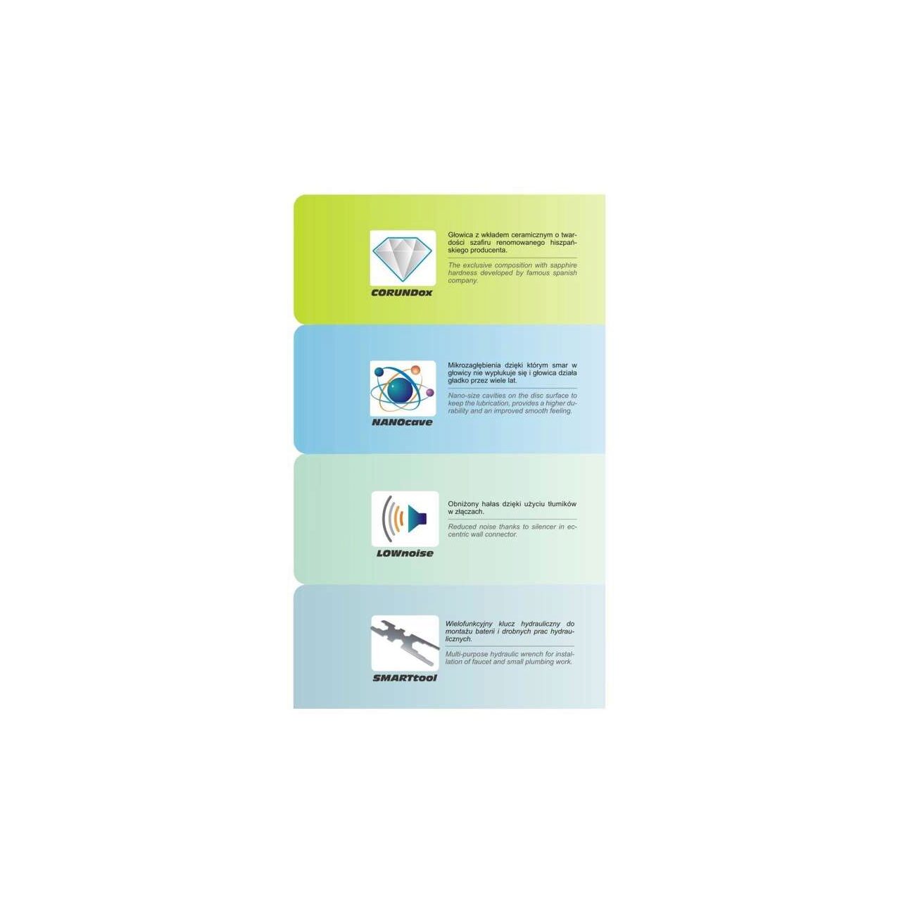 Bateria de duș Soria este o combinație unică a unui stil modern de corp crom, solid, din alamă, cu componente de înaltă calitate și tehnologii unice: CORUNDox - un cap cu o inserție ceramică cu o duritate safir a unui renumit producător spaniol (Sedal) NANOcave - eficient zgomot redus datorită utilizării amortizoarelor de zgomot în conectorii LOWnoise - o protecție mai bună la calcar : structura fagure de miere înlocuiește inserțiile clasice din plasă, care tind să crească SMARTtool - cheie hidraulică multifuncțională pentru montarea bateriilor și a instalațiilor sanitare minoreBateria are un cap de la un renumit producător spaniol (Sedal) echipat cu un sinter ceramic CORUNDox cu o duritate safir cu depresiuni microscopice pe suprafața NANOcave , care protejează grăsimea de spălare.