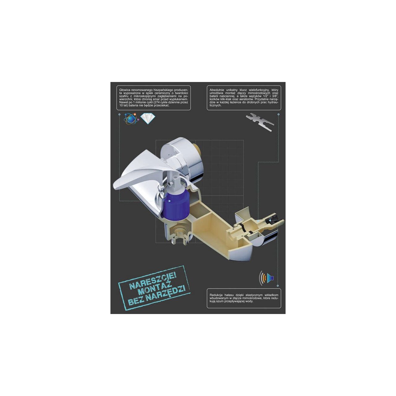 Mixerul de duș Tarragona este o combinație unică a unui stil modern de corp crom, solid, din alamă, cu componente de înaltă calitate și tehnologii unice: CORUNDox - un cap cu inserție ceramică cu o duritate safir a renumitului producător spaniol (Sedal) NANOcave - eficient zgomot redus datorită utilizării amortizoarelor de zgomot în conectorii LOWnoise - o protecție mai bună la calcar : structura fagure de miere înlocuiește inserțiile clasice din plasă, care tind să crească SMARTtool - cheie hidraulică multifuncțională pentru asamblarea robinetului și lucrări minore de instalații sanitareBateria are un cap de la un renumit producător spaniol (Sedal) echipat cu un sinter ceramic CORUNDox cu o duritate safir cu depresiuni microscopice pe suprafața NANOcave , care protejează grăsimea de spălare.