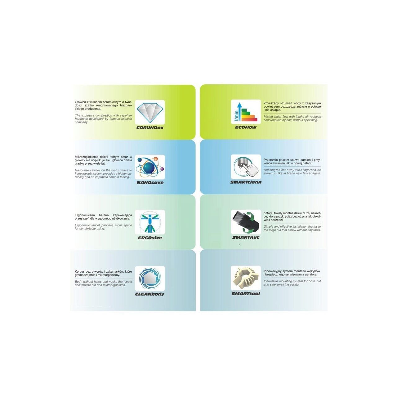 Robinetul de lavoar Alicante este o combinație unică a unui stil modern de corp crom, solid, din alamă, cu componente de înaltă calitate și tehnologii unice: CORUNDox - un cap cu inserție ceramică cu o duritate safir a unui renumit producător spaniol (Sedal) NANOcave - micro- cavități datorită cărora grăsimea din cap nu este spălată și capul rulează lin timp de mulți ani ERGOsize - baterie ergonomică care oferă spațiu pentru o utilizare confortabilă CLEANbody - corp fără găuri și colțuri care acumulează murdărie și microorganisme ECOflow - un flux mixt de apă cu aer aspirat economisește consumul cu mai mult de jumătate și nu stropeste SMARTclean - ștergerea cu degetul aeratorului Swiss Neoperl îndepărtează calcarul și restabilește fluxul ca în noul robinet SMARTnut - asamblare ușoară și durabilă, mulțumesc la o piuliță mare pe care o înșurubați fără a utiliza instrumente SMARTtool - sistem inovator de asamblare a furtunului fără scule și întreținere sigură a aeratorului Bateria are un cap de la un renumit producător spaniol (Sedal) echipat cu un sinter ceramic CORUNDox cu duritate safir cu depresiuni microscopice la suprafațăNANOcave , care protejează grăsimea împotriva spălării.