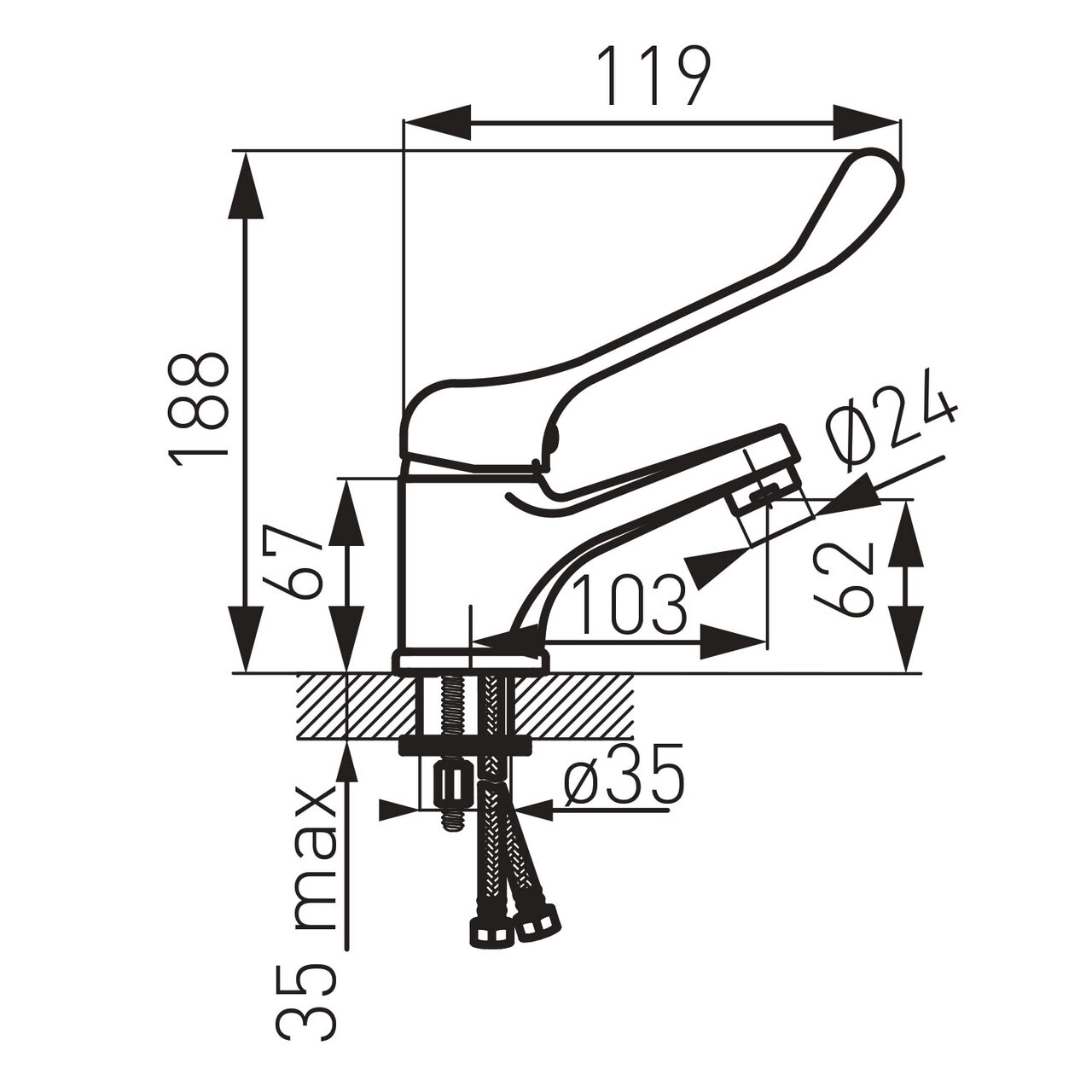 Fluxul este stabil și ușor de controlat datorită cartușului ceramic, iar clasa de debit A susține alimentarea eficientă a lavoarului în utilizări frecvente. Integrarea unui ventil automat G5/4 facilitează evacuarea controlată a apei, utilă în spații cu trafic intens. Aeratorul M24x1 produce un jet uniform și direcționat, contribuind la o clătire previzibilă. Dimensiunile echilibrate, cu înălțimea de 188 mm și lungimea pipei de 103 mm, optimizează spațiul de lucru deasupra cuvei. Construcția susține reglaje repetate fără efort, iar direcționarea jetului ajută la reducerea stropirii în jurul lavoarului. Ansamblul este conceput pentru acționare rapidă și feedback tactil clar la deschidere și închidere.