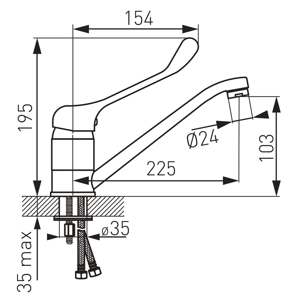 Concepută pentru utilizare zilnică, această baterie oferă control stabil al apei prin cartuș ceramic pentru reglaj precis, reducând blocajele și fluctuațiile de debit. Corpul din alamă asigură rezistență mecanică și fiabilitate pe termen lung, potrivită pentru medii intens utilizate. Pipă cu rotire ușoară pentru manevrare comodă permite orientarea rapidă a jetului între cuve sau recipiente, facilitând spălarea și clătirea. Lungimea pipei de 225 mm oferă acoperire confortabilă a zonei de lucru, iar înălțimea totală de 195 mm ajută la integrarea sub polițe sau dulapuri joase. Racordurile flexibile G3/8 - M10x1 simplifică conectarea la alimentarea existentă, limitând timpul de montaj și adaptările suplimentare.