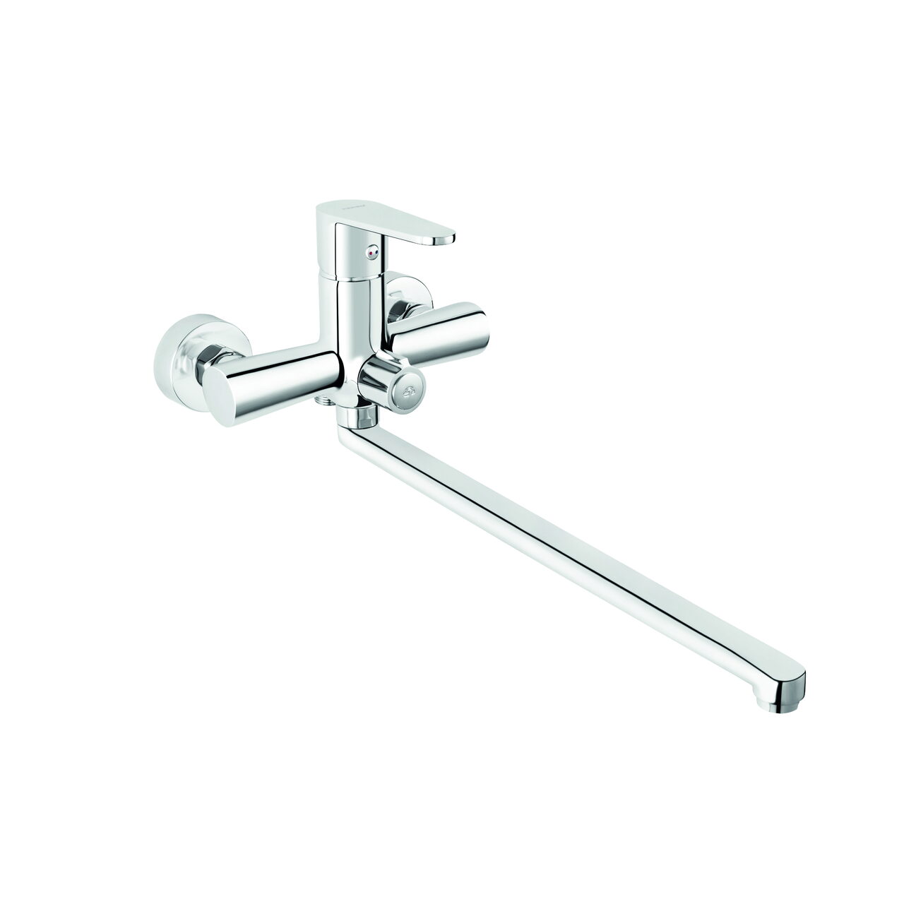 Pipa pivotantă de 35,2 cm oferă o rază extinsă pentru umplerea căzii și dirijarea jetului către duș, menținând spațiul de lucru liber când nu este folosită. Controlul se face prin cartuș ceramic pentru control precis, care ajută la reglarea fină a temperaturii și a debitului. Trecerea între ieșiri este asigurată de comutator ceramic lavoar/duș, conceput pentru acționare fermă și predictibilă. Integrarea unui aerator M24x1 pentru un jet uniform susține un flux bine structurat, cu stropire redusă. Construcția pe perete eliberează zona căzii, iar designul cu pipă pivotantă permite orientarea flexibilă a apei, adaptându-se atât umplerii rapide, cât și clătirii accesoriilor de baie. Instalarea este facilitată de racordurile excentrice G1/2, compatibile cu standardul uzual, cu distanța între centre de 150 ± 20 mm pentru o adaptare corectă la prinderile existente. Corpul din alamă susține o structură robustă, iar încadrarea în Grup acustic N/II pentru funcționare controlată contribuie la confortul sonor al utilizării. Clasa de debit A/A indică un regim de curgere conform specificațiilor, fără sistem de economisire a apei integrat, util acolo unde este necesar debit susținut. Pipa pivotantă de 352 mm optimizează accesul în cadă, iar racordul excentric G1/2 pentru montaj pe perete asigură poziționarea corectă a întregului ansamblu. Configurația permite comutarea rapidă a fluxului între cadă și duș, în funcție de activitatea dorită.