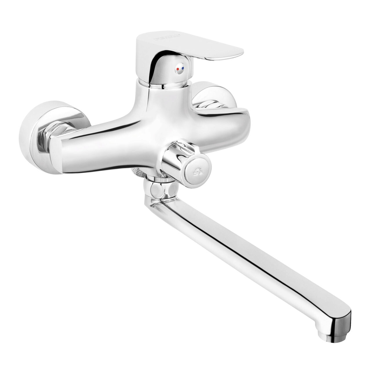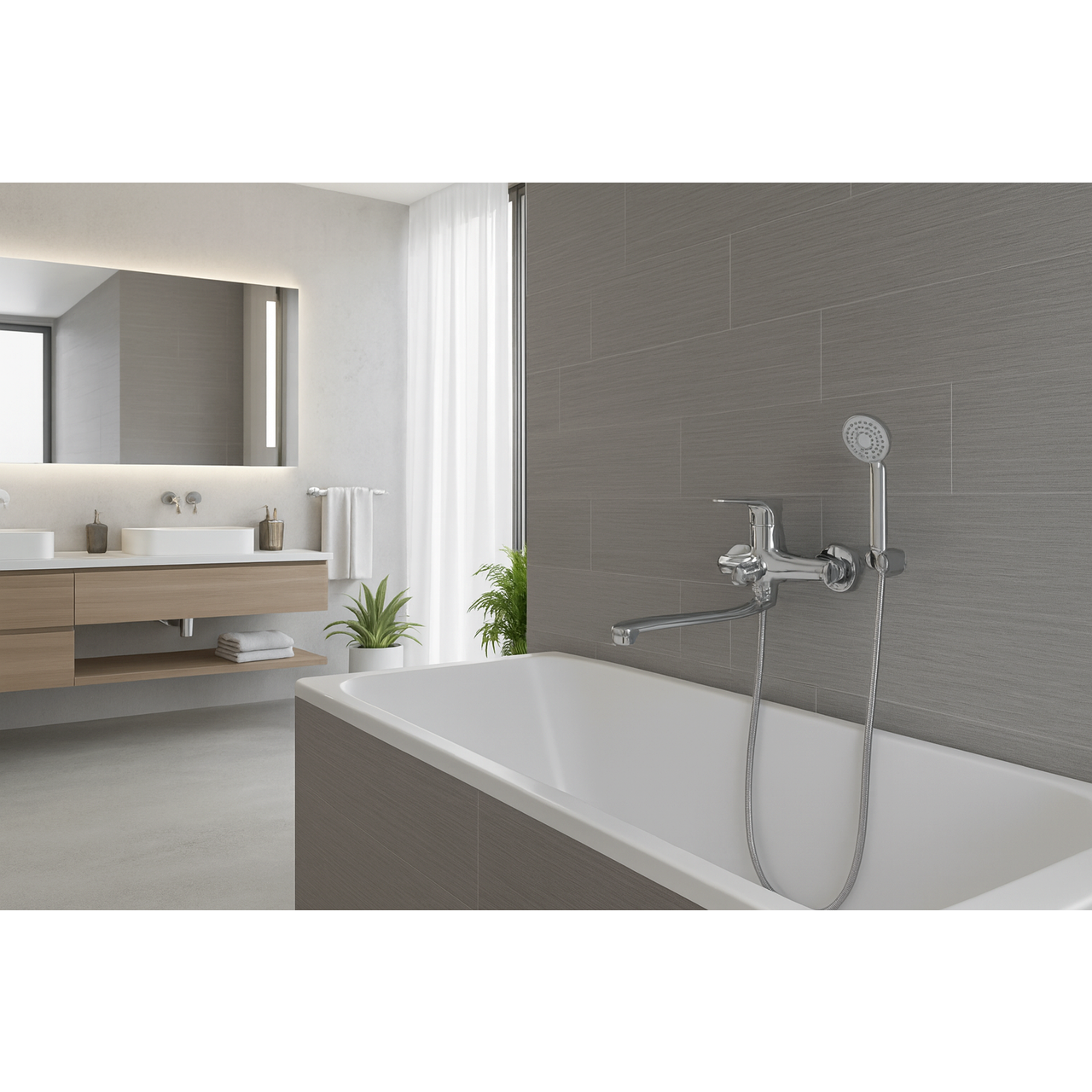 Pipa pivotantă oferă mobilitate pentru umplerea căzii și orientarea jetului acolo unde este nevoie, iar montajul pe perete optimizează spațiul din zonă. Conectarea se realizează prin racorduri excentrice G1/2, cu distanță între axe 150 ± 20 mm, facilitând alinierea la instalația existentă. Aeratorul M24x1 asigură un jet aerat, potrivit atât pentru cadă, cât și pentru duș. Cartușul ceramic contribuie la reglarea precisă a debitului și a temperaturii. Carcasa din alamă oferă o structură solidă, concepută pentru utilizare frecventă în baie. Încadrarea în grup acustic II/II și clasa de debit A/S indică parametri de funcționare adaptați scenariilor uzuale de alimentare a căzii și dușului, fără componente de economisire a apei.