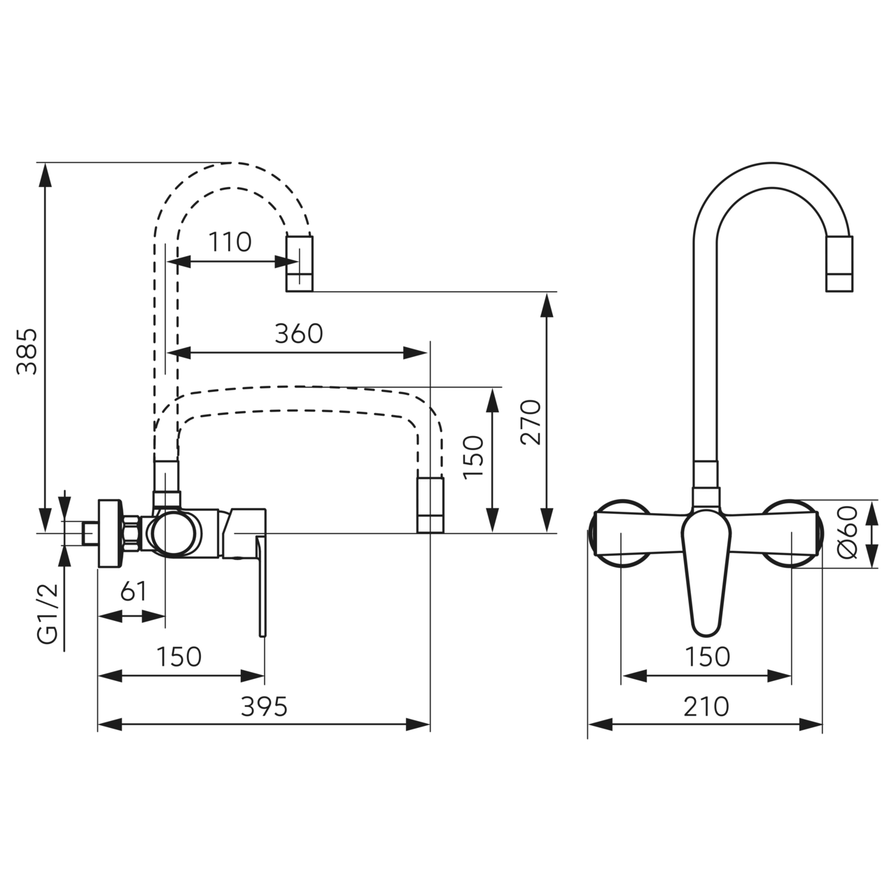 Nu sunt necesare piese atipice; bateria folosește racorduri excentrice G1/2, uzuale în instalațiile de perete cu interax de 150 mm.