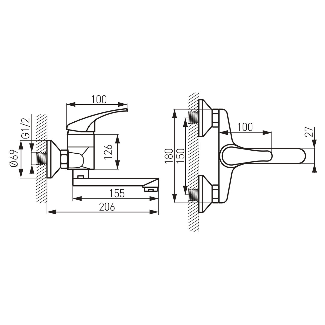 Da. Bateria se montează pe perete cu racorduri excentrice G1/2 și acceptă o distanță între racorduri de 150 ± 20 mm, acoperind instalațiile cu axe apropiate de 150 mm.