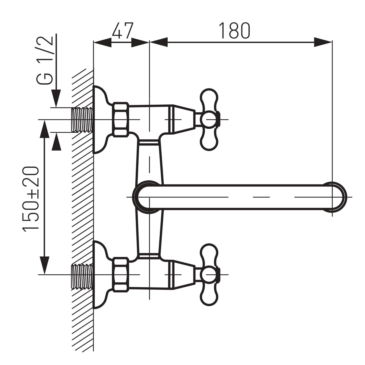 Este destinată montajului pe perete, cu racorduri excentrice G1/2 la o distanță de 150 ± 20 mm, asigurând alinierea corectă la ieșirile de apă existente.
