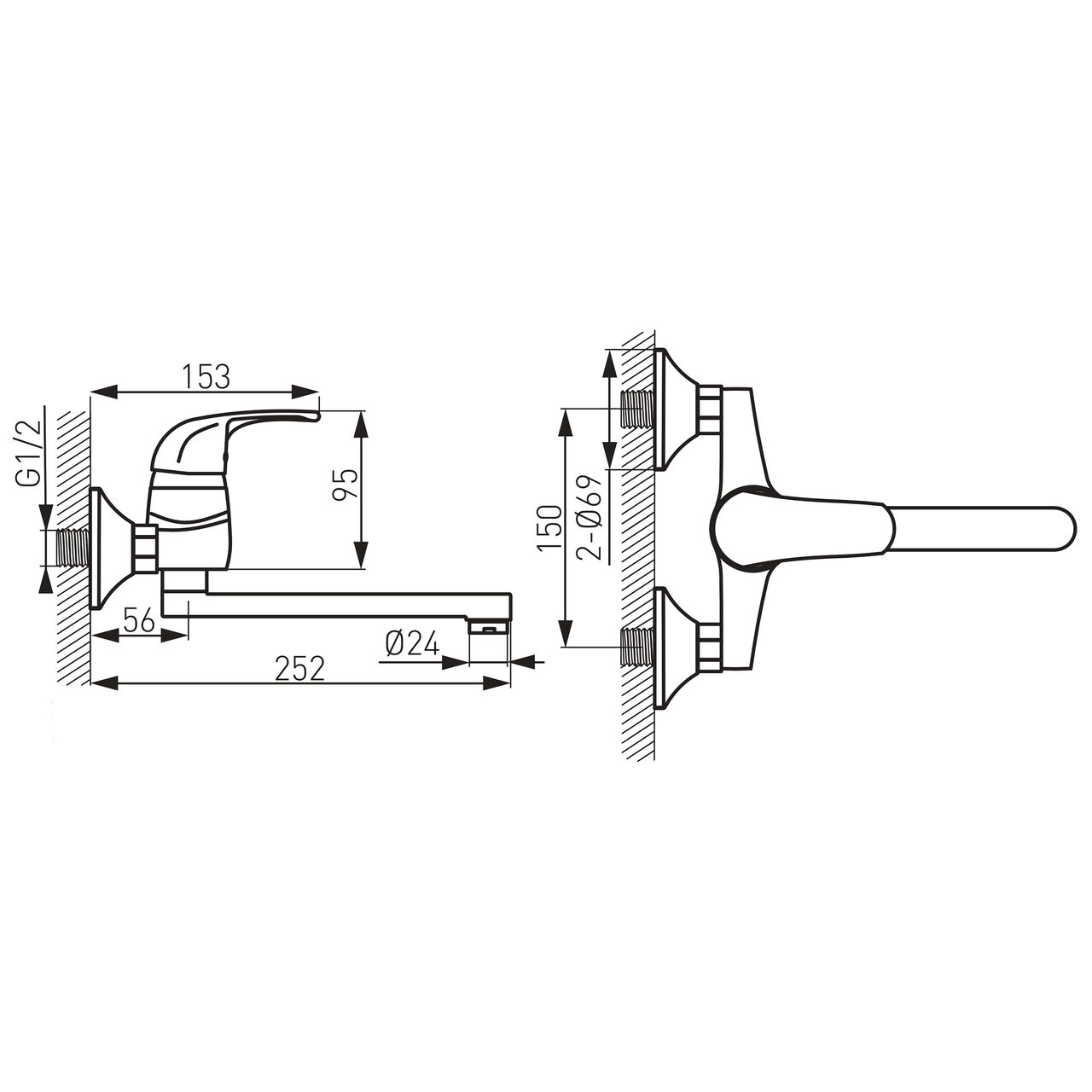 Da. Se montează pe perete cu racorduri excentrice G1/2 și acceptă distanță între axe de 150 ± 20 mm, potrivită pentru majoritatea instalațiilor uzuale.
