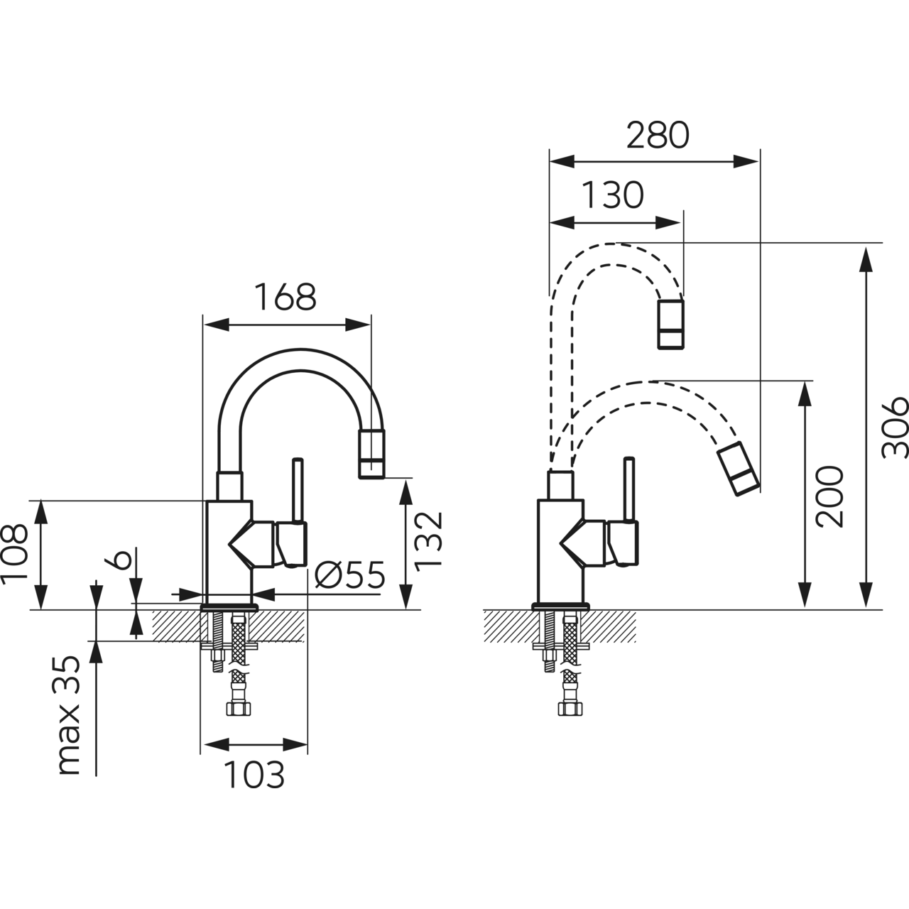 Pipa flexibilă, cu lungime 130-280 mm, permite orientarea ușoară a jetului pe zona dorită, utilă la clătirea lavoarului sau a obiectelor.