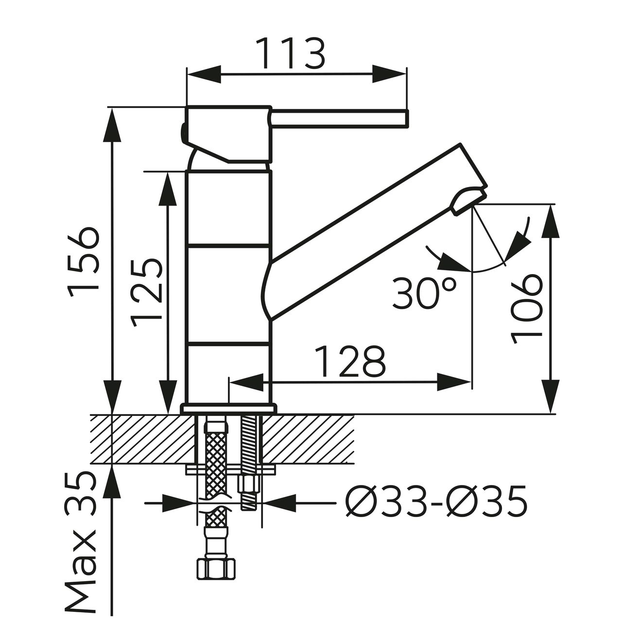 Controlul temperaturii și al debitului este asigurat de un cartuș ceramic pentru reglaj precis, care contribuie la o operare stabilă în timp. Corpul este realizat din alamă pentru durabilitate și rezistență la uzură, menținând aspectul și funcționalitatea în utilizare zilnică. Proporțiile sunt concepute pentru confort: înălțimea bateriei este de 156 mm, cu înălțime de evacuare de 106 mm pentru spațiu de lucru adecvat și lungimea pippii de 128 mm pentru ghidarea jetului. Funcția de jet este echipată cu aerator M18x1, pentru o curgere uniformă. Produsul aparține Grupului acustic II și Clasei de debit A, oferind parametri definiți de proiect pentru utilizare previzibilă.