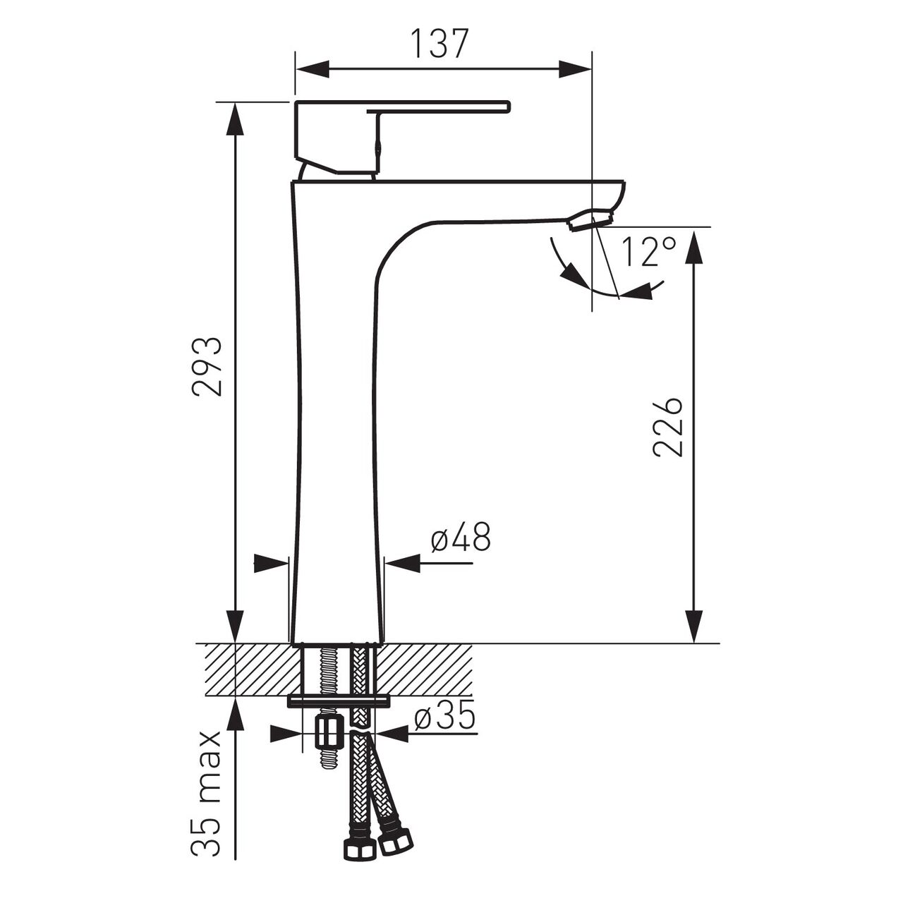 Înălțimea de evacuare a apei este de 225 mm, iar lungimea pipei este de 179 mm, pentru manevrare confortabilă în zona jetului.