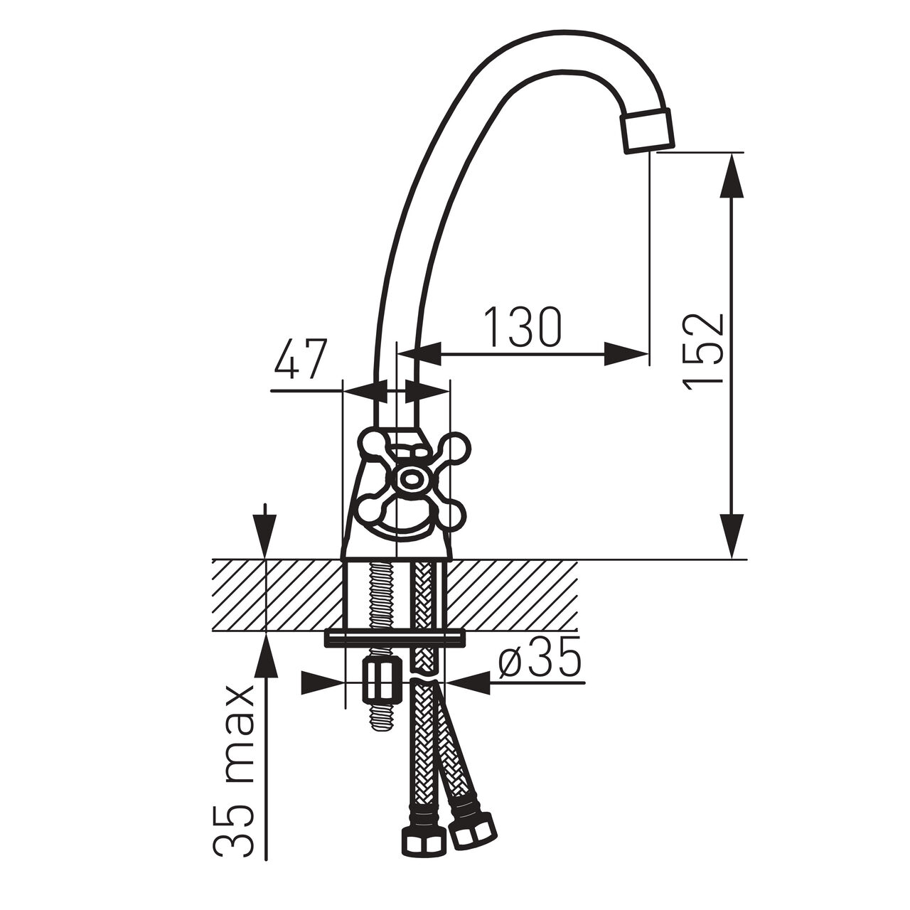 Proiectată pentru montaj pe lavoar, soluția oferă racordare sigură prin racorduri flexibile G3/8 - M10x1, facilitând conectarea la instalațiile uzuale fără adaptări complexe. Jetul este stabilizat de aeratorul M22x1 pentru flux uniform, ceea ce reduce stropirea și îmbunătățește confortul zilnic. Lungimea pipei de 130 mm asigură o rază practică de utilizare pentru spălare, umplerea vaselor mici și clătire. Carcasa din alamă contribuie la o structură solidă și la o manevrare previzibilă în timp. Elementul de control tip cap glisor permite ajustarea rapidă a debitului și temperaturii. Produsul nu include ventil de scurgere, lăsând libertate de alegere în funcție de tipul lavoarului și configurarea existentă a sifonului.