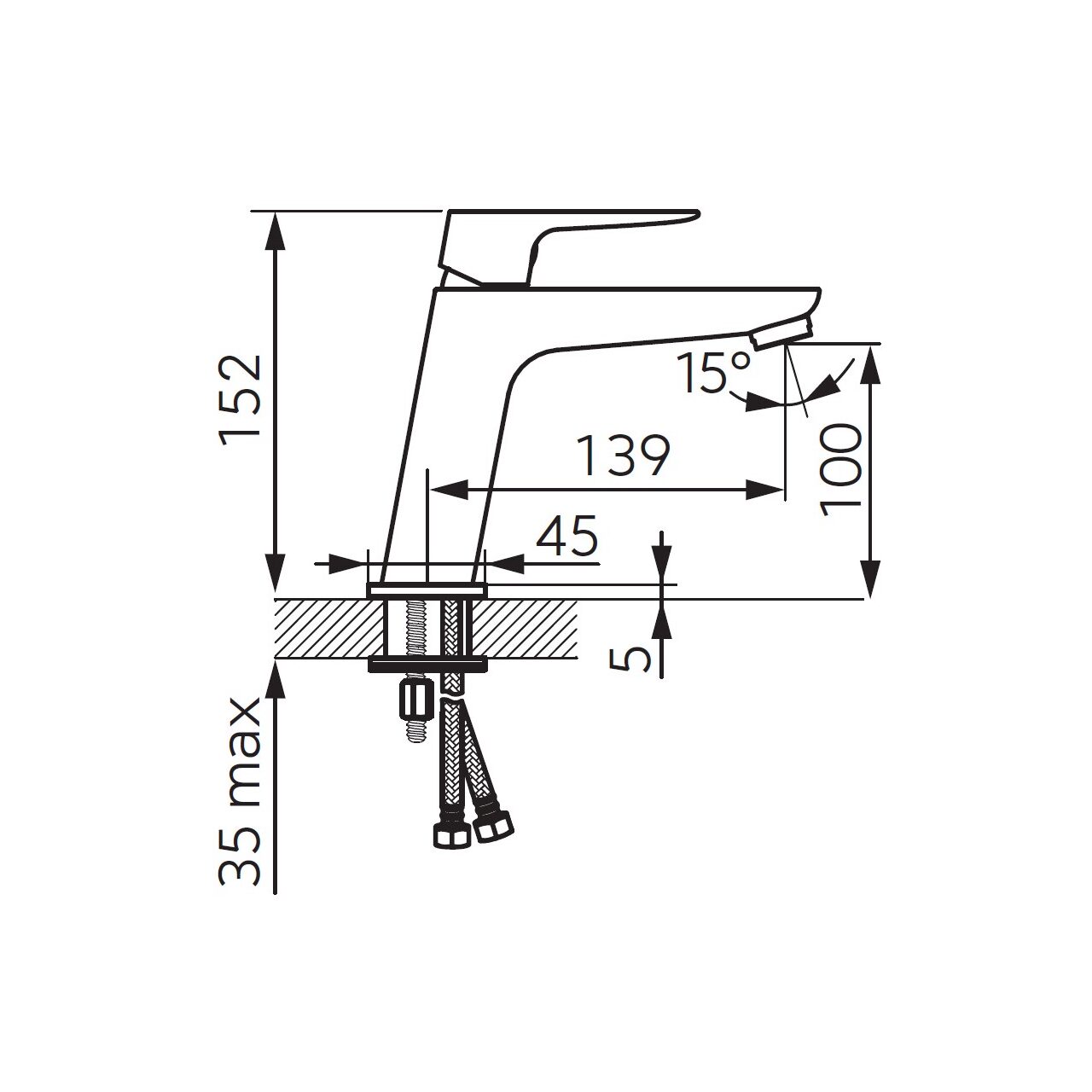 Înălțime baterie 152 mm, înălțime evacuare 100 mm și lungime pipă 139 mm, utile pentru alinierea cu lavoarul.