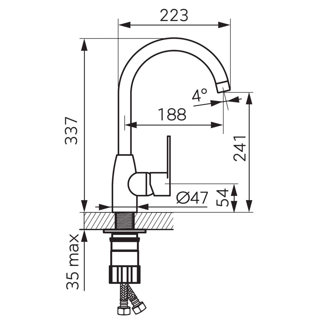 Înălțimea totală este 337 mm, înălțimea evacuării 241 mm, iar lungimea pipei 188 mm. Aceste valori ajută la evaluarea spațiului necesar sub și deasupra chiuvetei.