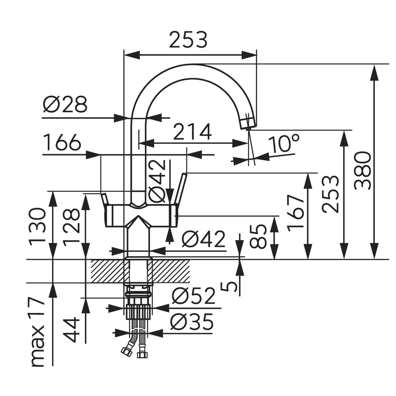 - Înălțime evacuare apă: 253 mm