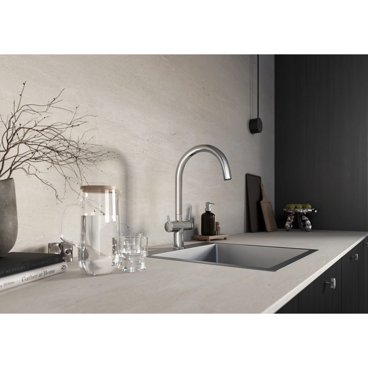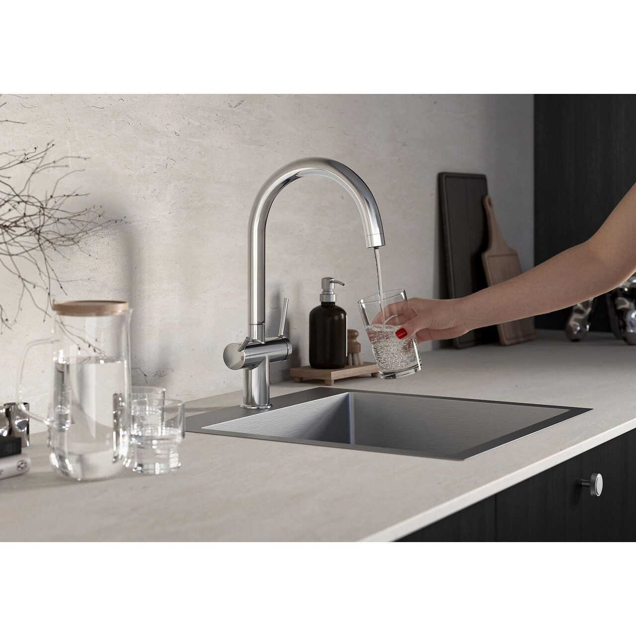 Proiectată pentru un flux dedicat de apă potabilă, soluția oferă acces rapid la alimentare pentru apă filtrată în bucătărie, cu manevrare precisă prin cartușe ceramice pentru control stabil. Construcția din corp din alamă pentru rezistență mecanică susține utilizarea zilnică și asigură o senzație solidă la operare. Designul stativ facilitează integrarea pe blat, păstrând spațiul de lucru liber. Parametrii de debit sunt clasa A/Z, astfel încât regimul de curgere este previzibil și ușor de controlat. Lipsa funcției Cold Start permite deschiderea rapidă cu apă mixtă, utilă când este necesară reglarea imediată a temperaturii și a volumului. Geometria este optimizată pentru activități de zi cu zi: înălțimea totală de 380 mm și înălțimea de evacuare a apei de 253 mm pentru spațiu util facilitează umplerea vaselor înalte. Lungimea piperii de 214 mm pentru acoperire comodă ajută la ghidarea jetului deasupra cuvei. Pipa cu rotire dublu pentru orientarea direcției jetului contribuie la manevrabilitate, iar aeratorul M22x1 stabilizează curgerea pentru un jet uniform. Toate acestea susțin fluxul de apă filtrată cu o poziționare precisă, reducând stropirea și optimizând utilizarea spațiului din jurul chiuvetei. Conectivitatea este simplificată prin racorduri flexibile G3/8 - M10x1 pentru instalare rapidă, compatibile cu alimentări uzuale din bucătărie. Aerator M22x1 pentru jet aerat constant asigură o distribuție stabilă a apei, cu reglaj al direcției prin mișcarea pipei. Clasa de debit A/Z pentru regim de curgere previzibil ajută la adaptarea rapidă a volumului la nevoile curente. Combinația dintre cartușele ceramice și carcasa din alamă menține acuratețea controlului, chiar și după cicluri frecvente de deschidere și închidere, pentru o experiență consecventă la fiecare utilizare. Absența unui sistem dedicat de economisire a apei permite debit integral când este necesar, iar menționarea explicită a Cold Start: nu pentru pornire mixtă oferă previzibilitate asupra modului de deschidere. Tipul pipei cu rotire dublu pentru poziționare flexibilă sprijină alternarea rapidă între sarcini, de la clătirea vaselor la umplerea recipientelor. Configurația generală este orientată către precizie, flux stabil și integrare facilă cu traseele existente, astfel încât apa filtrată să fie disponibilă imediat, cu un control ferm al direcției și volumului la punctul de consum.