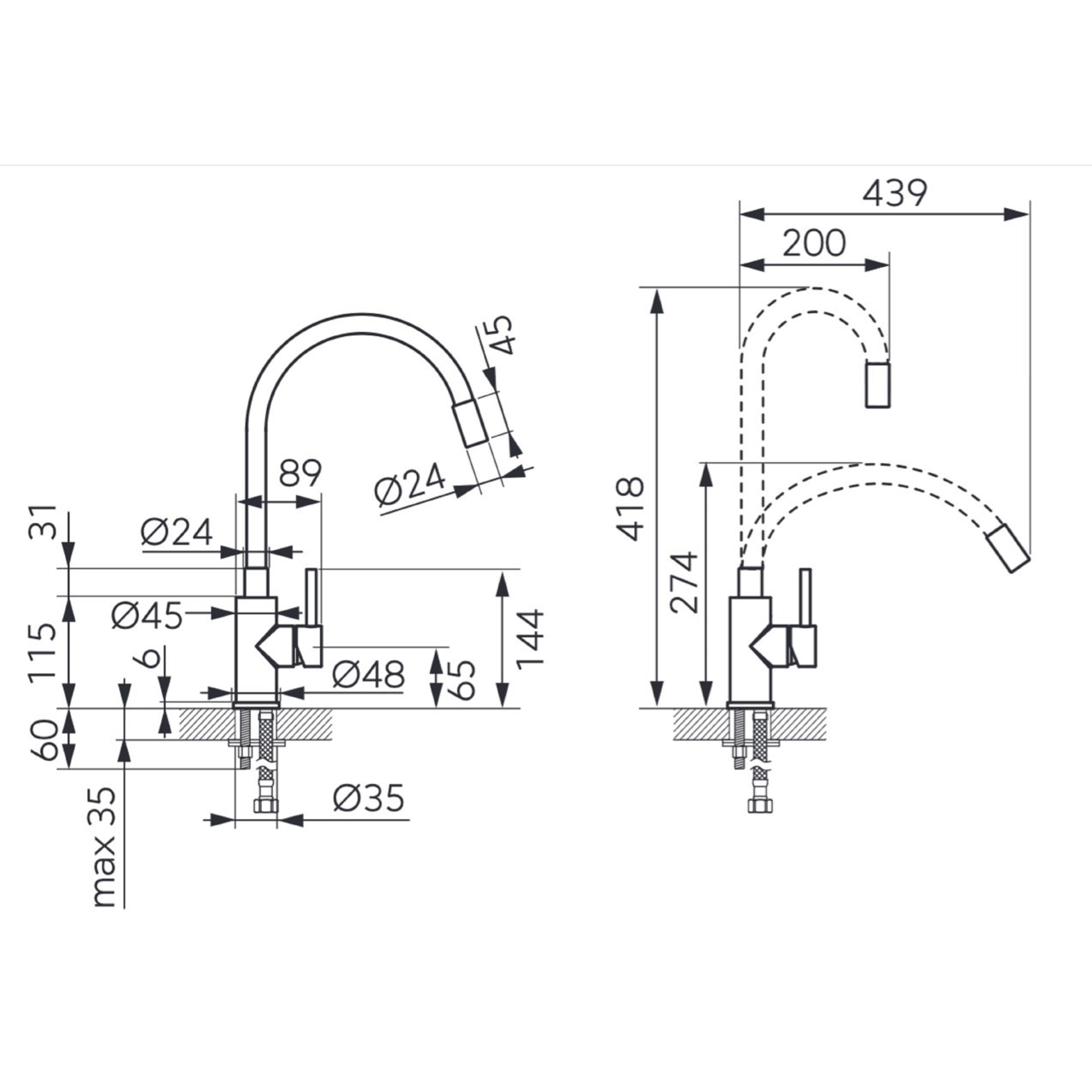 Da. Pipă flexibilă cu rotire și lungime 150-350 mm, împreună cu înălțimea totală 280-440 mm, permit orientarea precisă pentru umplerea vaselor înalte.