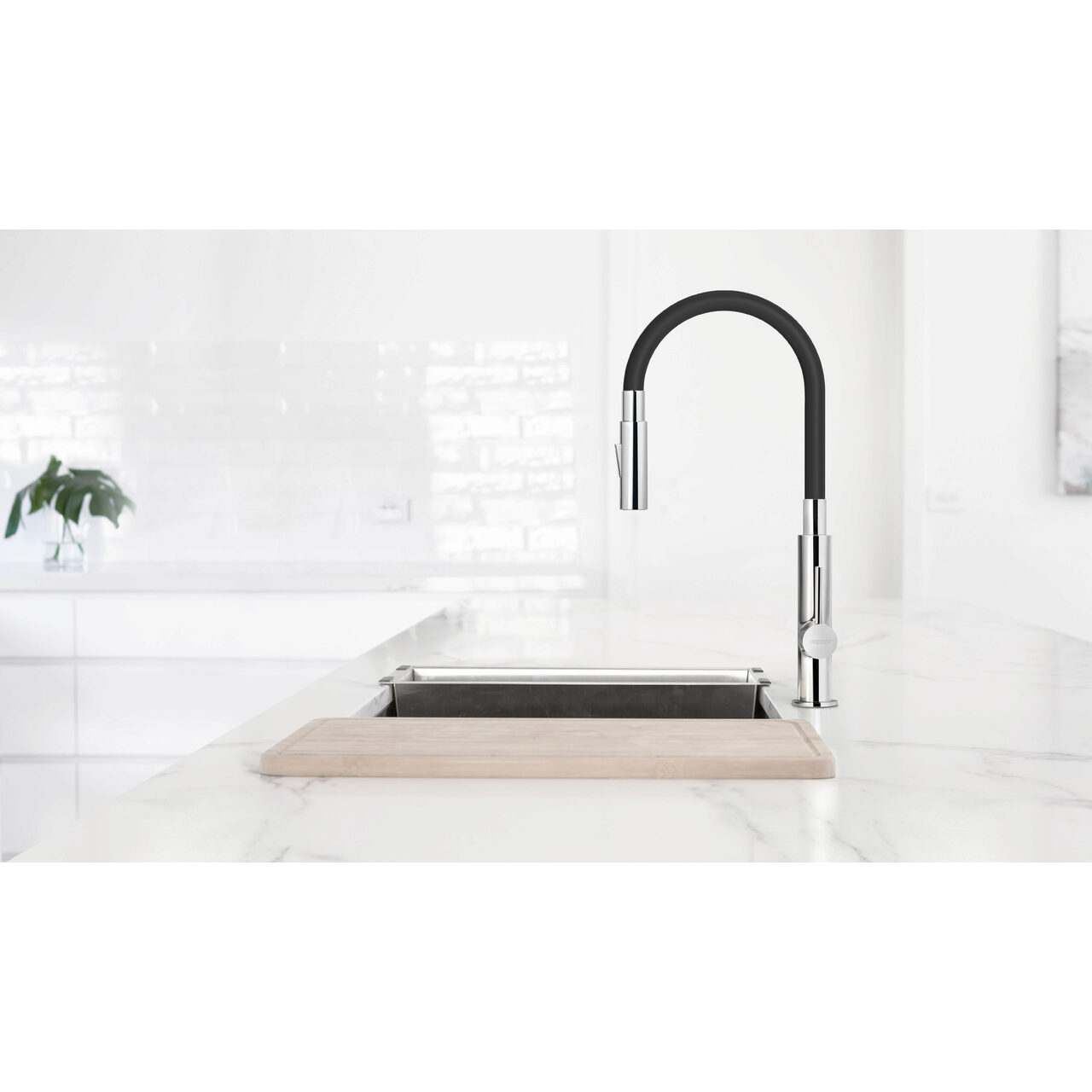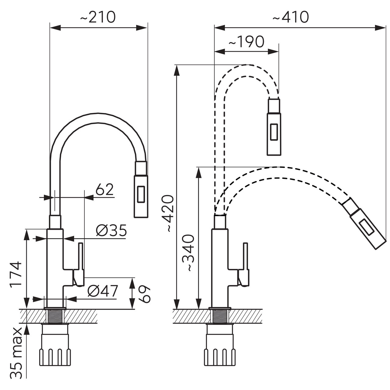 Pipa flexibilă permite orientarea precisă a apei pe chiuvetă, utilă pentru vase voluminoase sau zone greu accesibile. Intervalul de lucru al pipei, de la 190 la 410 mm, oferă libertate de mișcare fără a ocupa spațiu inutil. Construcția din alamă susține o utilizare consecventă, iar elementul de control cu cartuș ceramic asigură reglaje ferme și repetabile. Clasa de debit Z/Z contribuie la un flux previzibil, iar grupul acustic I/II indică un nivel sonor gestionat al curgerii. Racordurile flexibile G3/8 - M8x1 simplifică conectarea la alimentare, iar intervalul de înălțime de 340-420 mm facilitează integrarea în diferite configurații de blat fără compromisuri de utilizare.