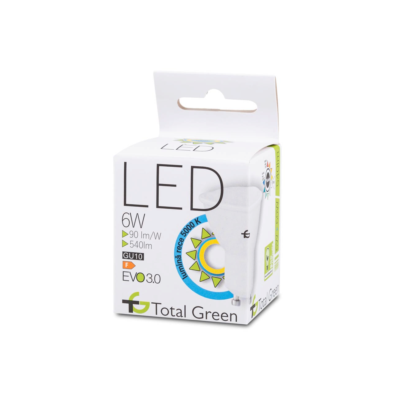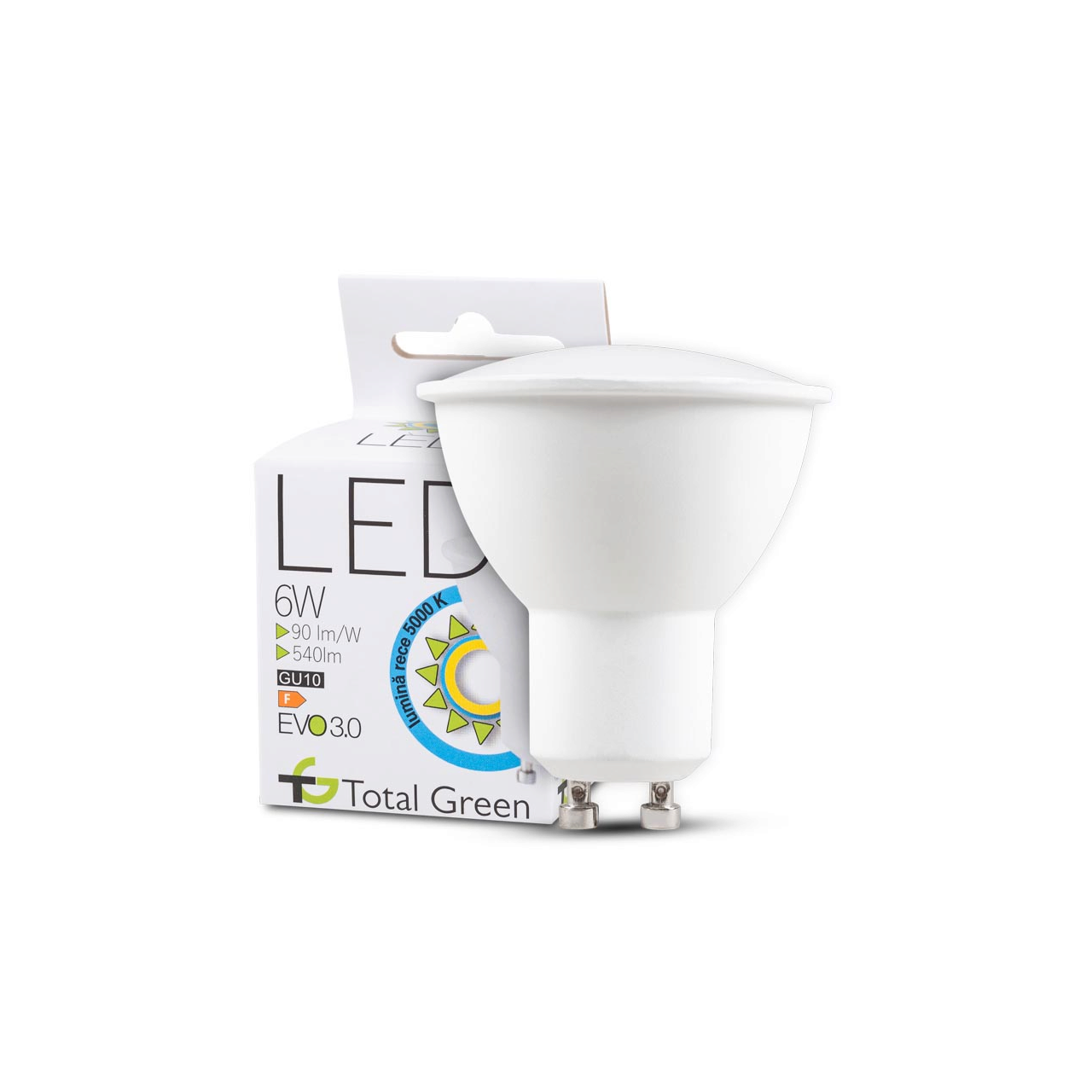 Becurile LED marca Total Green creează contraste bogate și iluminează spatiile cu o atmosferă de curatenie si stralucire. Acestea sunt disponibile într-o gamă variată de forme si dimensiuni, fiind concepute pentru a se potrivi unei multitudini de corpuri de iluminat si aplicatii. Cu o putere de 6W si o dulie de tip GU10, acestea va ofera fluxul de lumina calda necesar cu o valoare de 540lm. Aceste produse sunt create special pentru a rezista la o tensiune nominala cuprinsa intre 220 si 240V si o frecventa nominala de 50-60Hz. De asemenea, factorul de protectie este egal cu IP20.