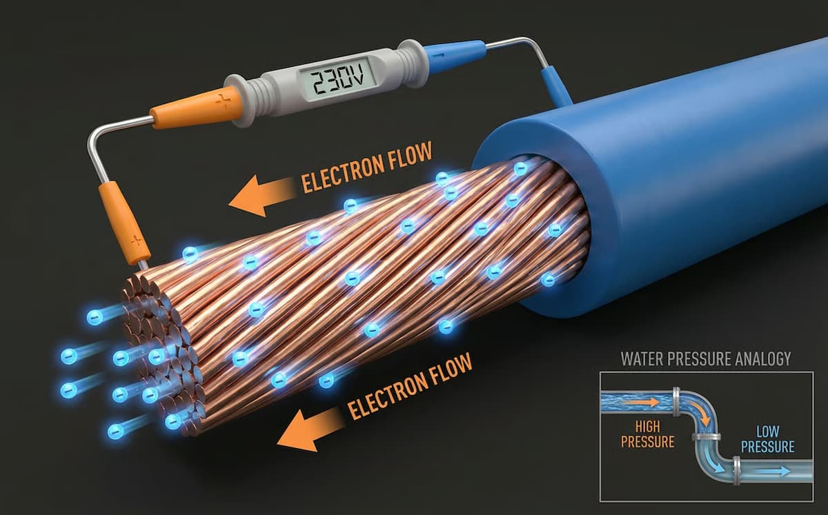 Din punct de vedere fizic și pentru o ilustrare plastică, tensiunea electrică poate fi înțeleasă ca "presiunea", dacă putem spune astfel, care ”împinge” curentul electric prin instalațiile noastre, similar modului în care presiunea apei determină curgerea acesteia prin conducte.