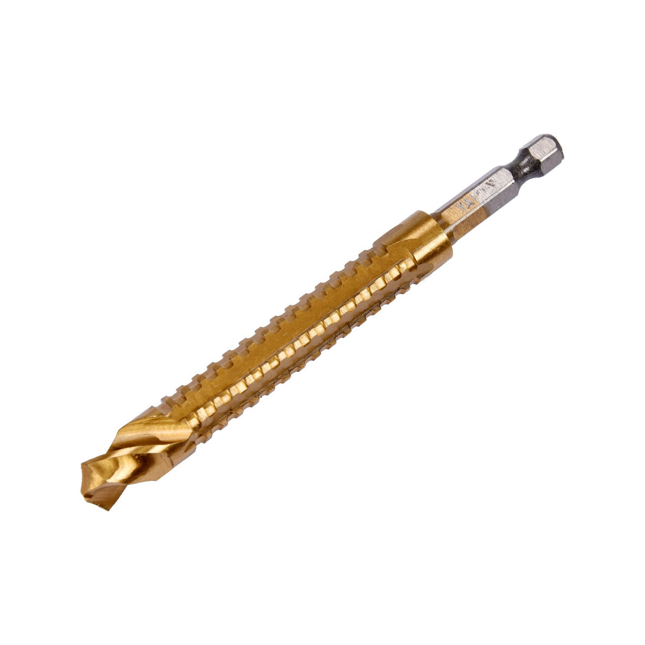 Burghiu fabricat din oțel rapid HSS 4241 de înaltă calitate, acoperit cu nitrură de titan . Destinat uzului profesional, industrial.