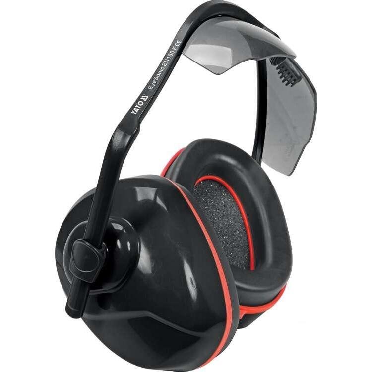 Căștile anti-zgomot integrate cu ochelari de protecție gri înlocuibili YT-74635 protejează nu numai auzul utilizatorului, ci și ochii acestuia. Căștile reglabile de pe articulațiile sferice funcționează și ca o bandă pentru cap, ceea ce vă permite să lucrați, de exemplu, cu o cască de protecție fără presiune suplimentară asupra capului.