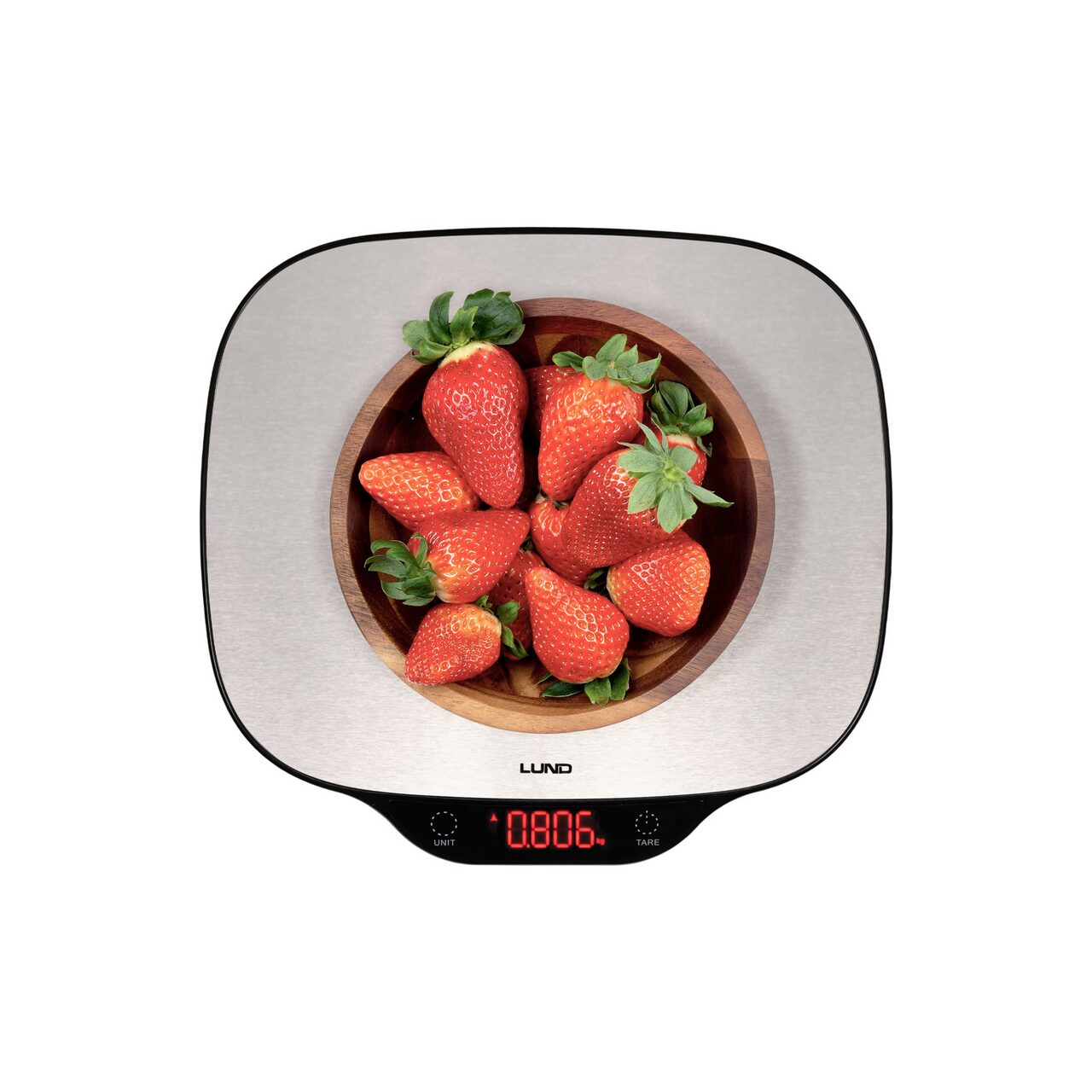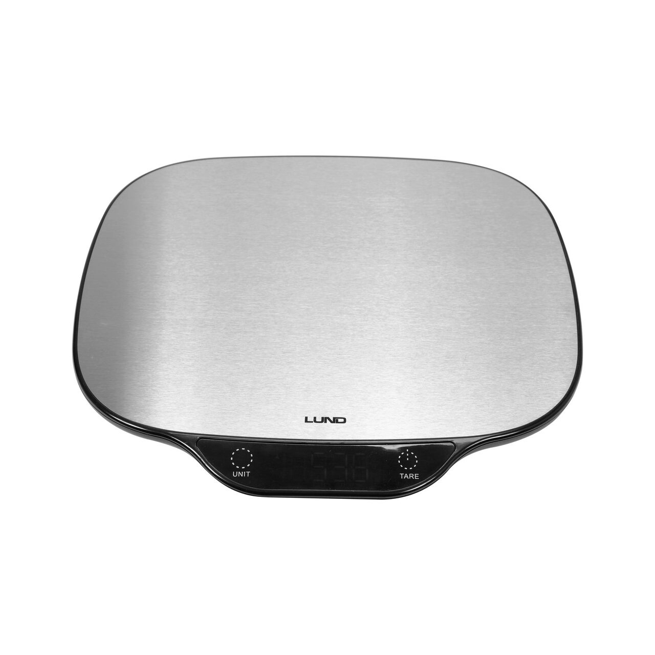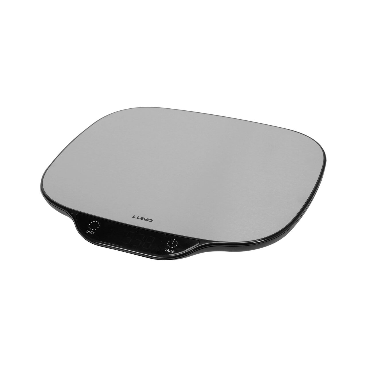 Cântar de bucătărie LUND cu placă mare din oțel inoxidabil. Echipat cu un afișaj LCD clar care afișează 3 unități de greutate selectabile, precum și indicatori de supraîncărcare și baterie descărcată. Cântarul este echipat cu patru senzori extensometrici de înaltă calitate. Sarcina maximă este de până la 5 kg.