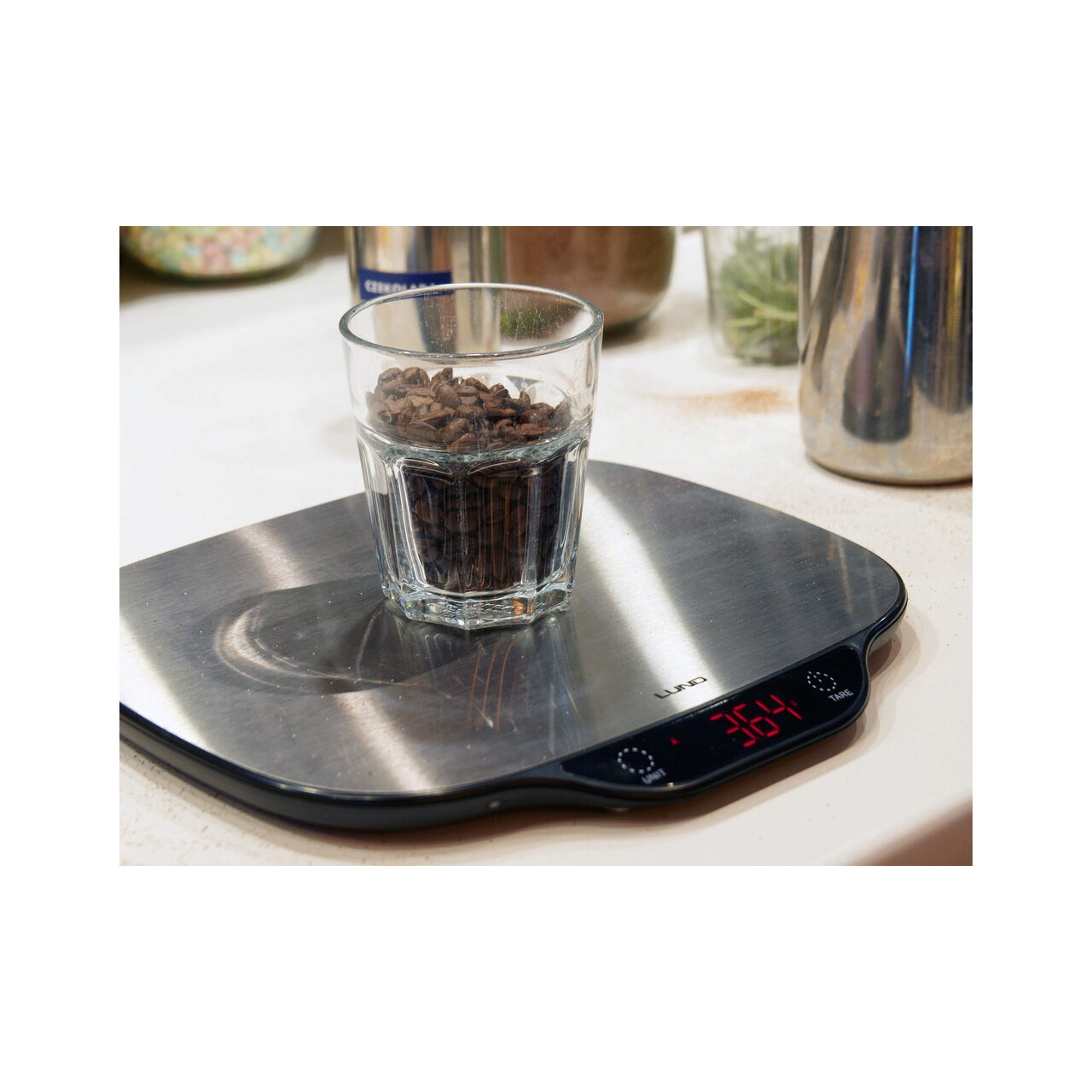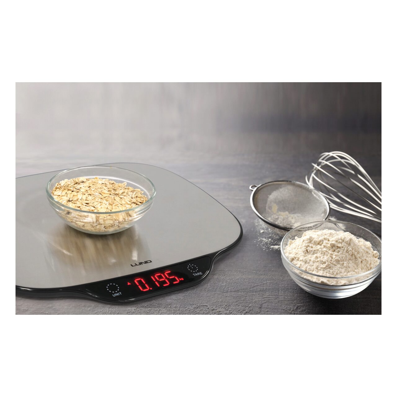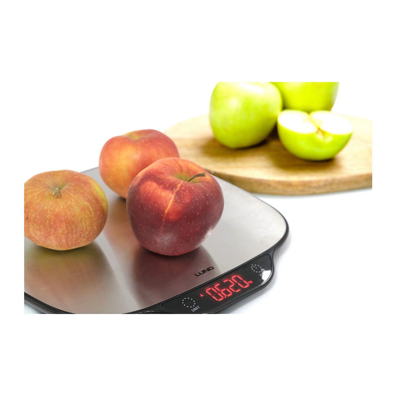Cântar de bucătărie LUND cu placă mare din oțel inoxidabil. Echipat cu un afișaj LCD clar care afișează 3 unități de greutate selectabile, precum și indicatori de supraîncărcare și baterie descărcată. Cântarul este echipat cu patru senzori extensometrici de înaltă calitate. Sarcina maximă este de până la 5 kg.