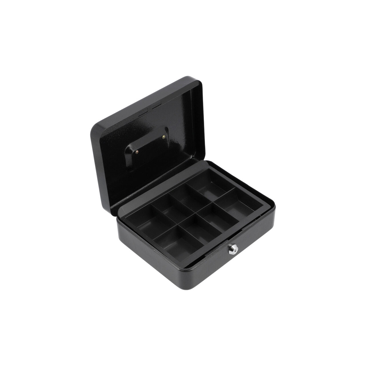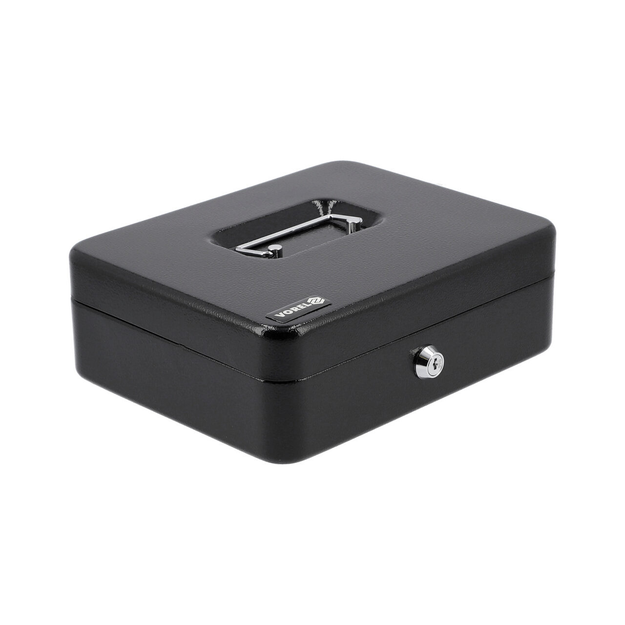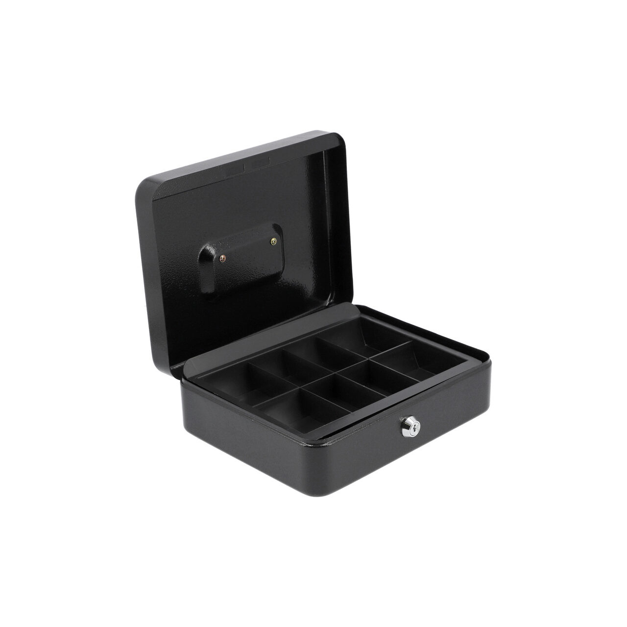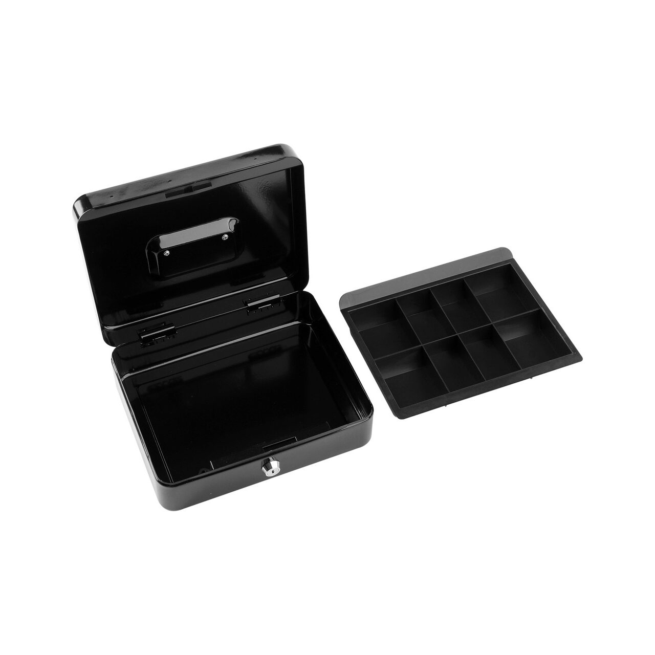 Cutie pentru bani portabilă 250x200x90mm. Fabricata din tablă de oțel grosime de 0,7 mm, culoare negru. Insertie pentru monede din plastic detașabil în interior.