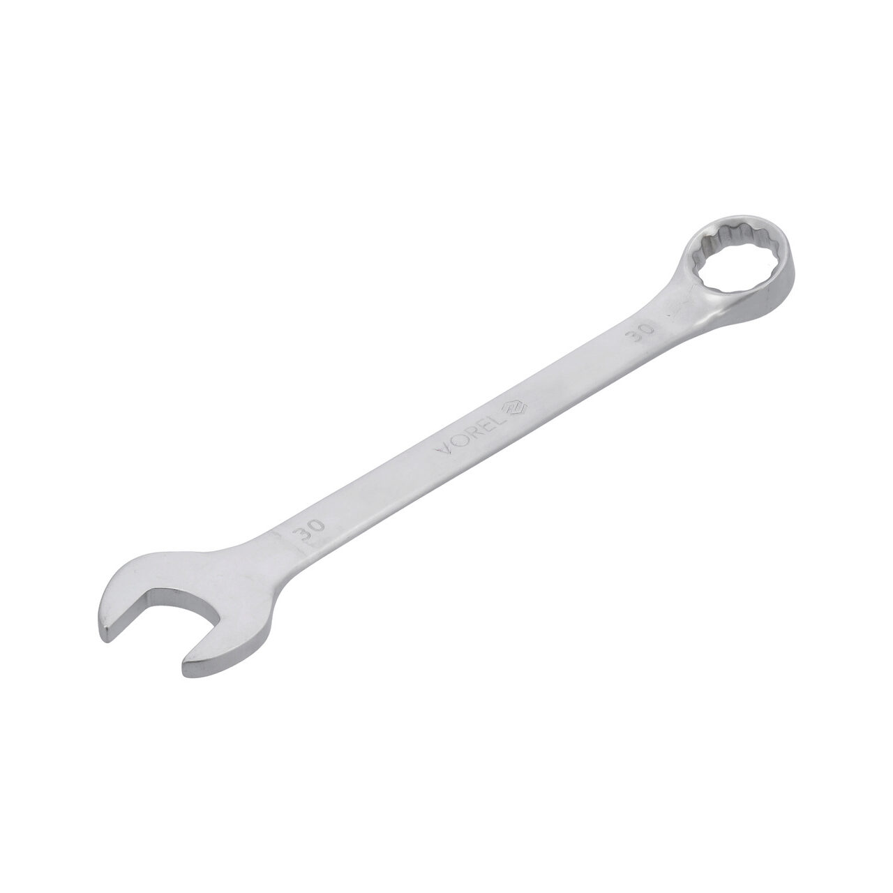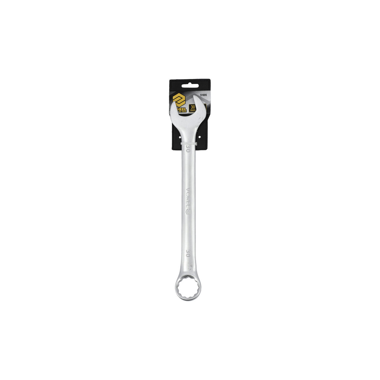 Cheie combinată 30 mm de Vorel 51695. Fabricată din oțel CrV vanadiu cromat. Cheie forjată, perfect calibrată. Finisajul satinat minimizează alunecarea cheii contaminate cu ulei. Capătul cu 12 fețe al cheii inelare, îndoit suplimentar, care facilitează manevrarea cheii.