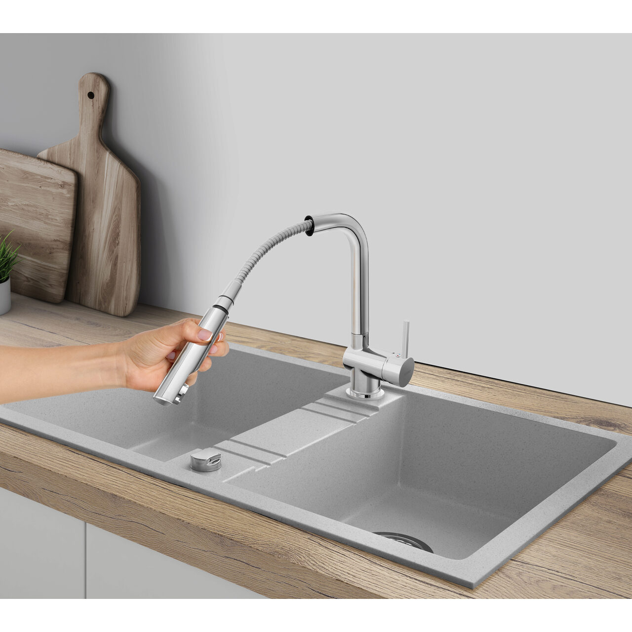 Două cuve identice facilitează separarea sarcinilor de spălare și clătire, iar gestionarea scurgerii prin dop automat cu buton de control eficientizează golirea fără a atinge apa. Construcția din compozit din granit pentru utilizare zilnică susține o utilizare practică în zona de lucru. Dimensiunile totale de 780 mm lungime și 480 mm lățime oferă spațiu dedicat în fiecare cuvă, cu 309 mm lungime și 410 mm lățime pe cuvă, pentru organizare clară a ustensilelor și vaselor. Înălțimea de 177 mm contribuie la o capacitate utilă echilibrată. Preaplinul integrat limitează riscul de revărsare accidentală, iar pachetul include dopul și sifonul, astfel încât elementele esențiale pentru racordare sunt deja pregătite.