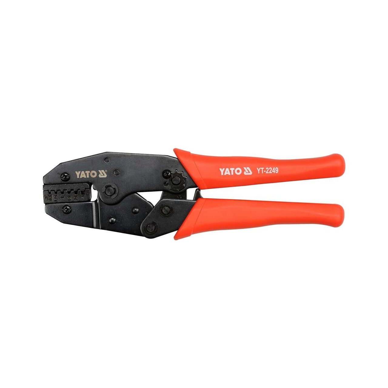 YT-2249 clește pentru sertizarea conectorilor, cu suprafață înnegrită, care protejează împotriva coroziunii, și cu capacele mânerului din plastic. Mecanismul cu clichet permite o prindere rapidă și precisă fără a utiliza o forță excesivă.