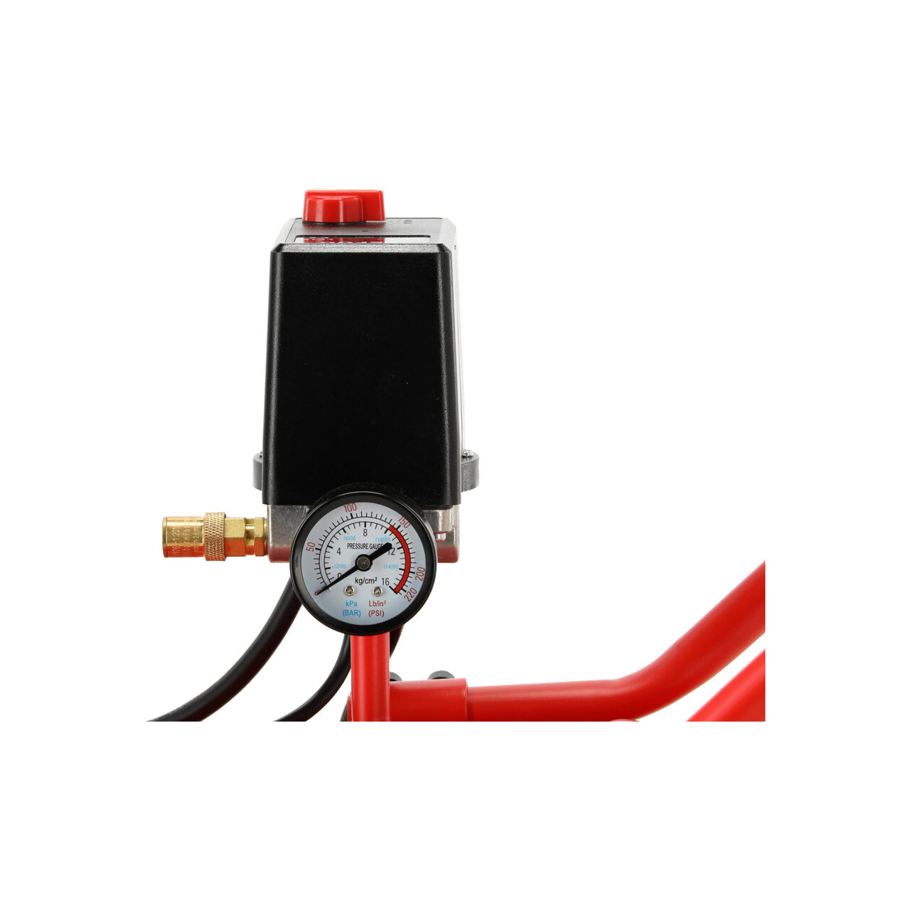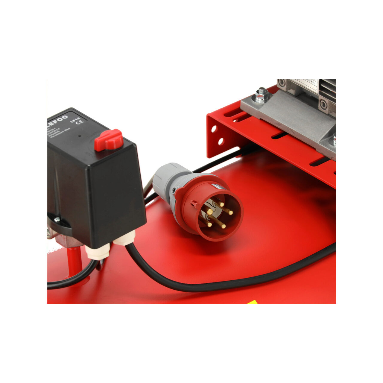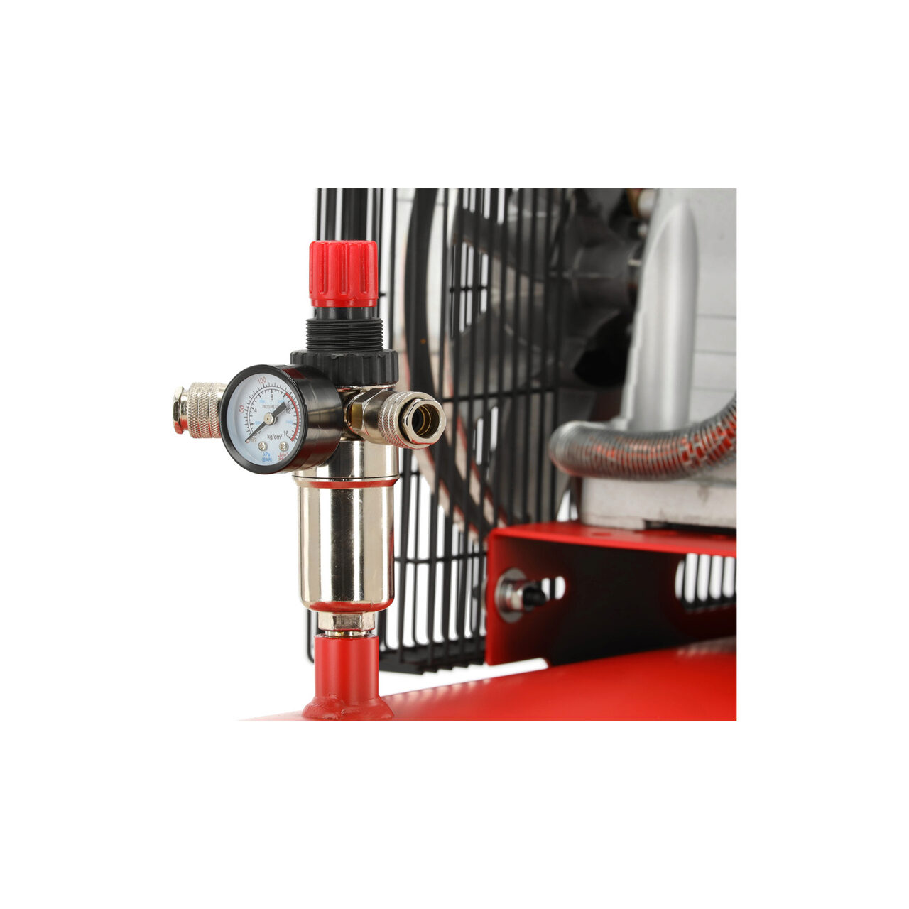 Compresor de ulei cu doi cilindri, cu două conexiuni și reglare a presiunii. Folosit pentru acționarea dispozitivelor cu aer comprimat, găurirea prin suflare și curățarea suprafețelor în industrie, ateliere, agricultură și pe șantiere de construcții.