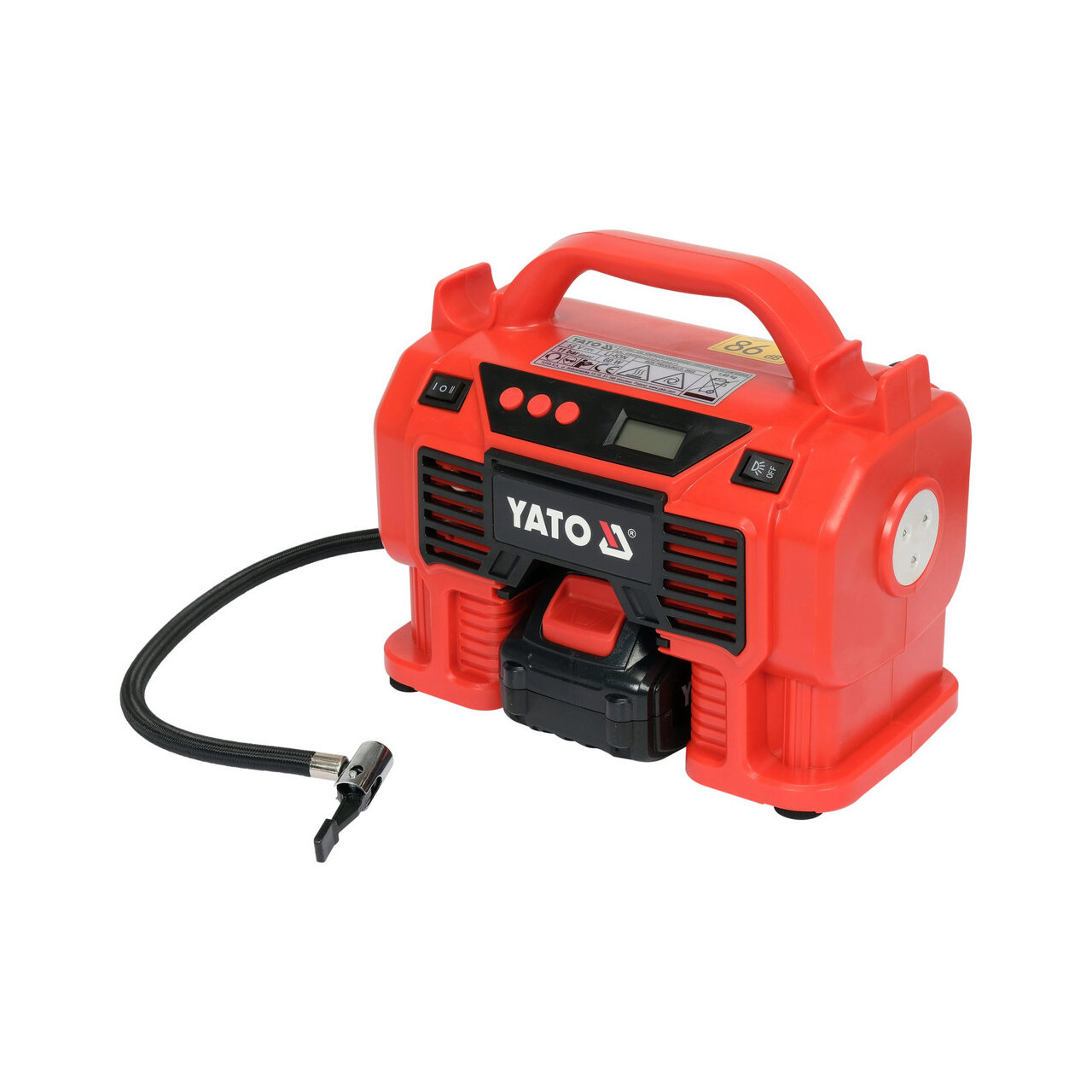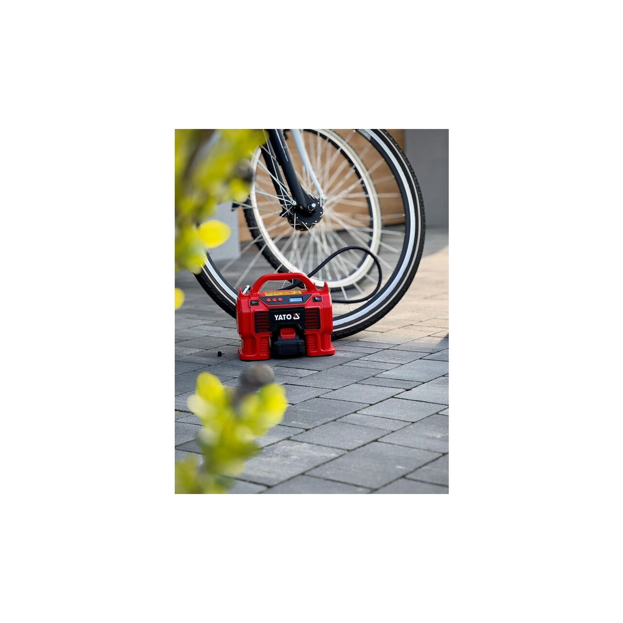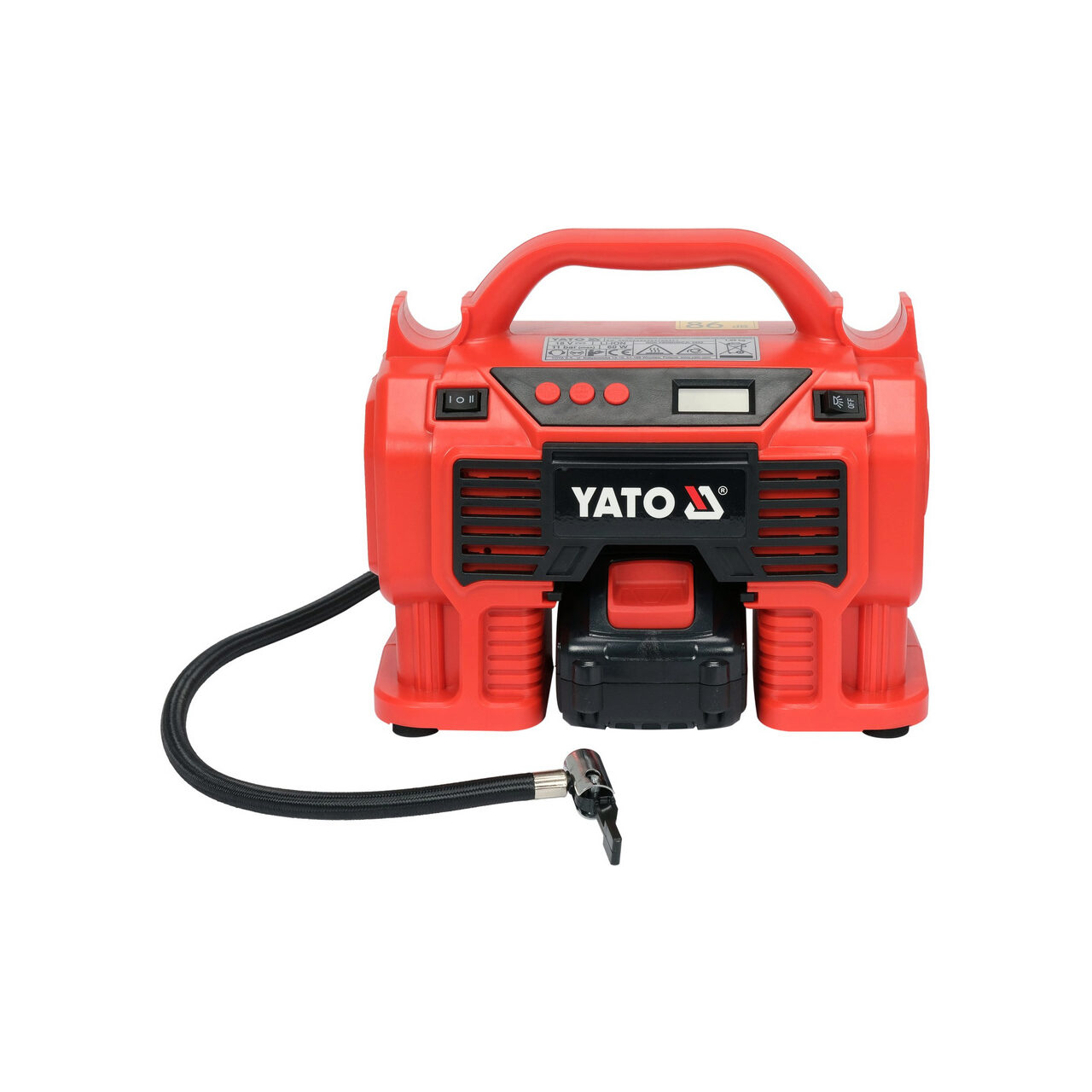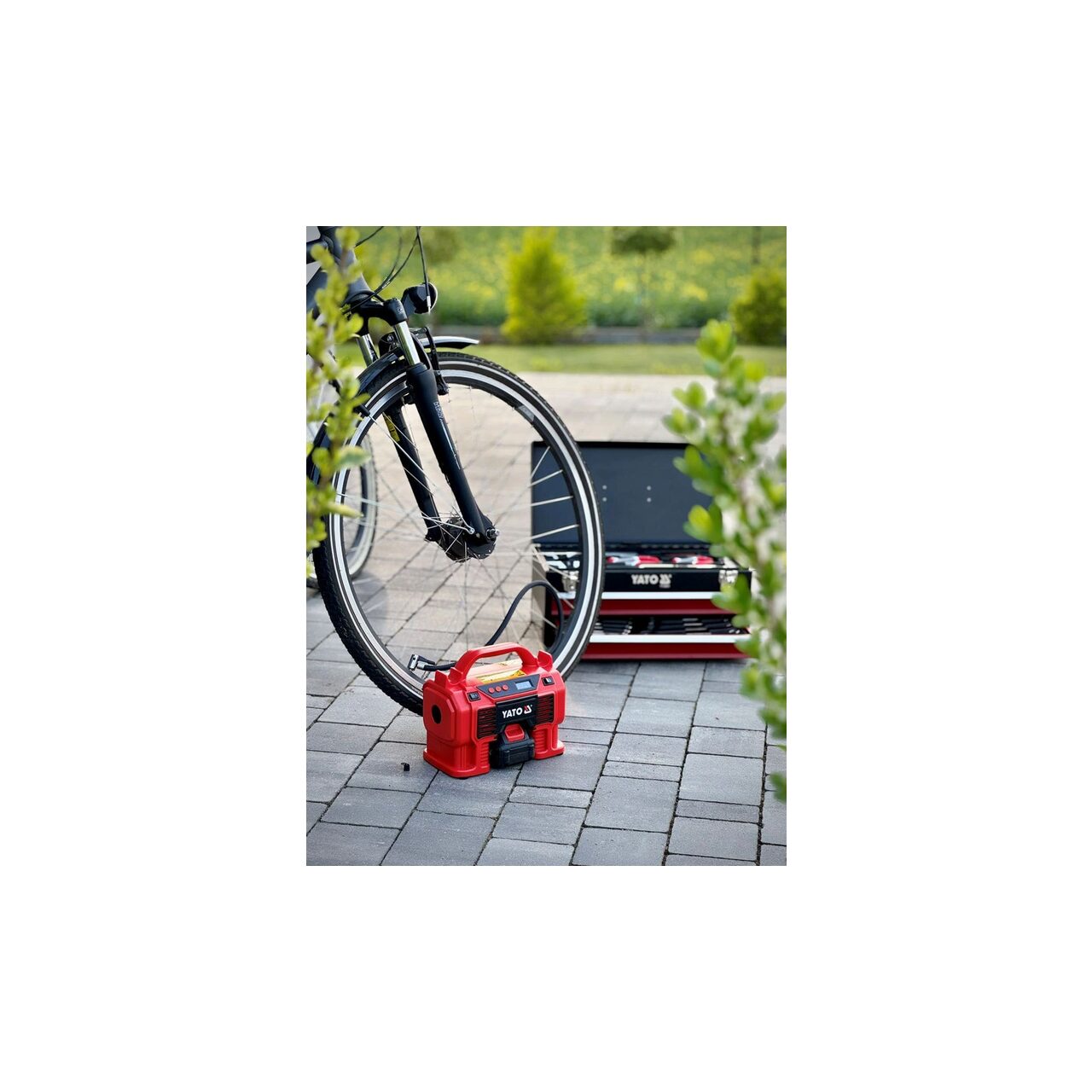 Compresor compact alimentat de o baterie YATO de 18 V și curent de la priza de brichetă de 12 V. Set cu o baterie de 3 Ah.