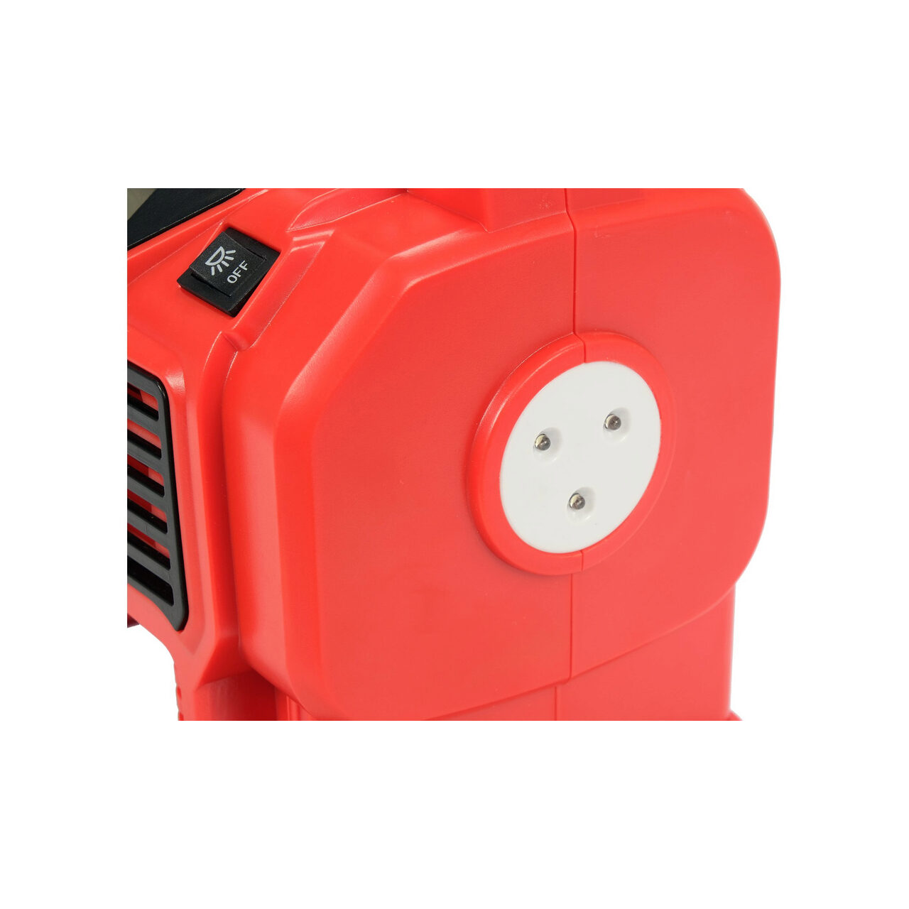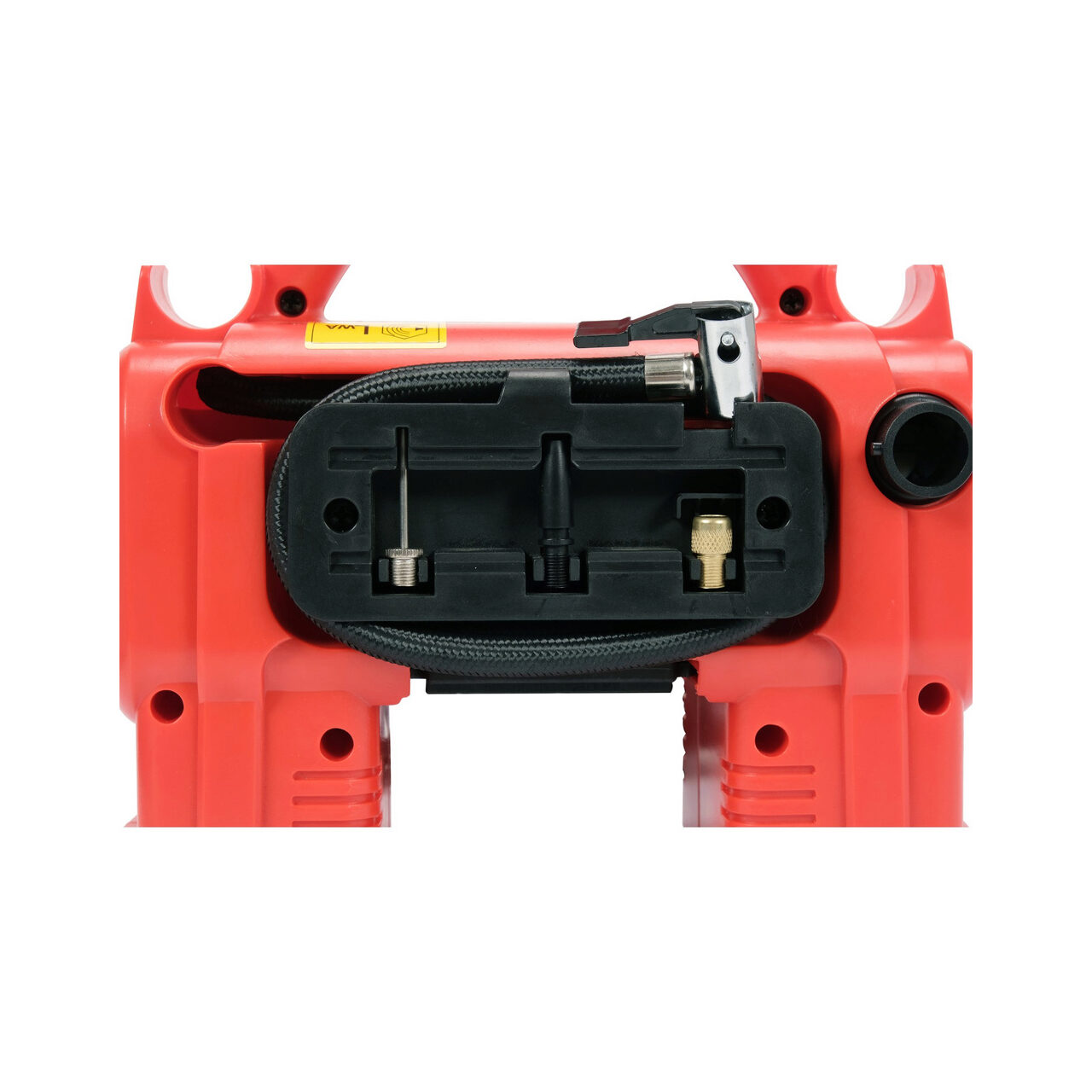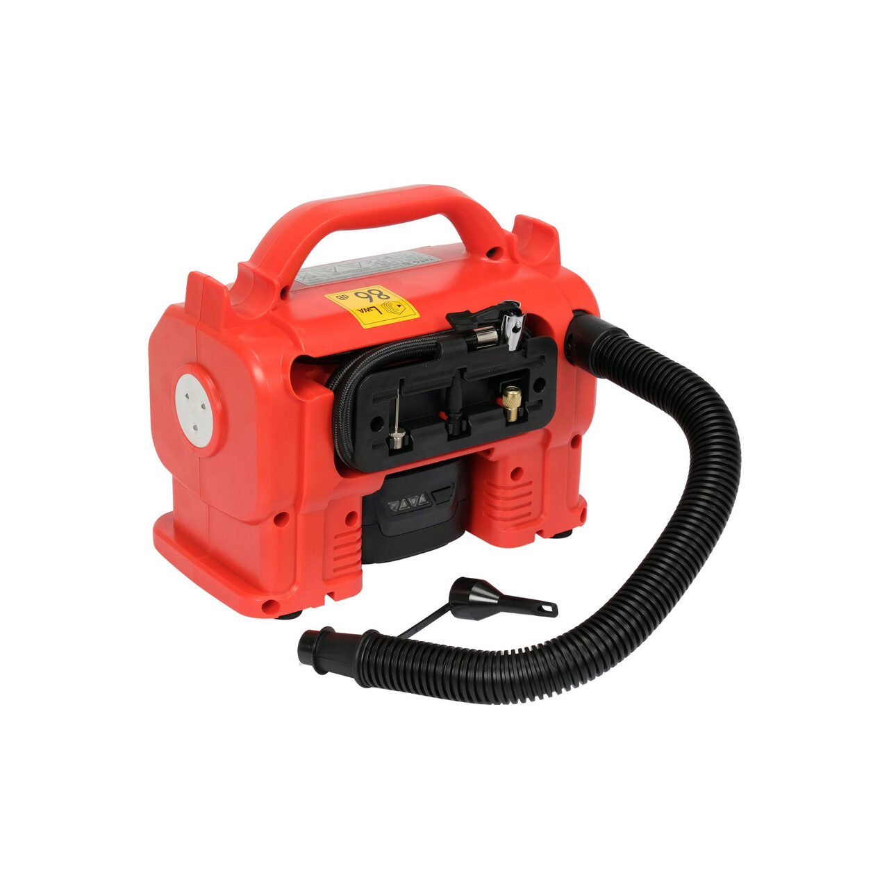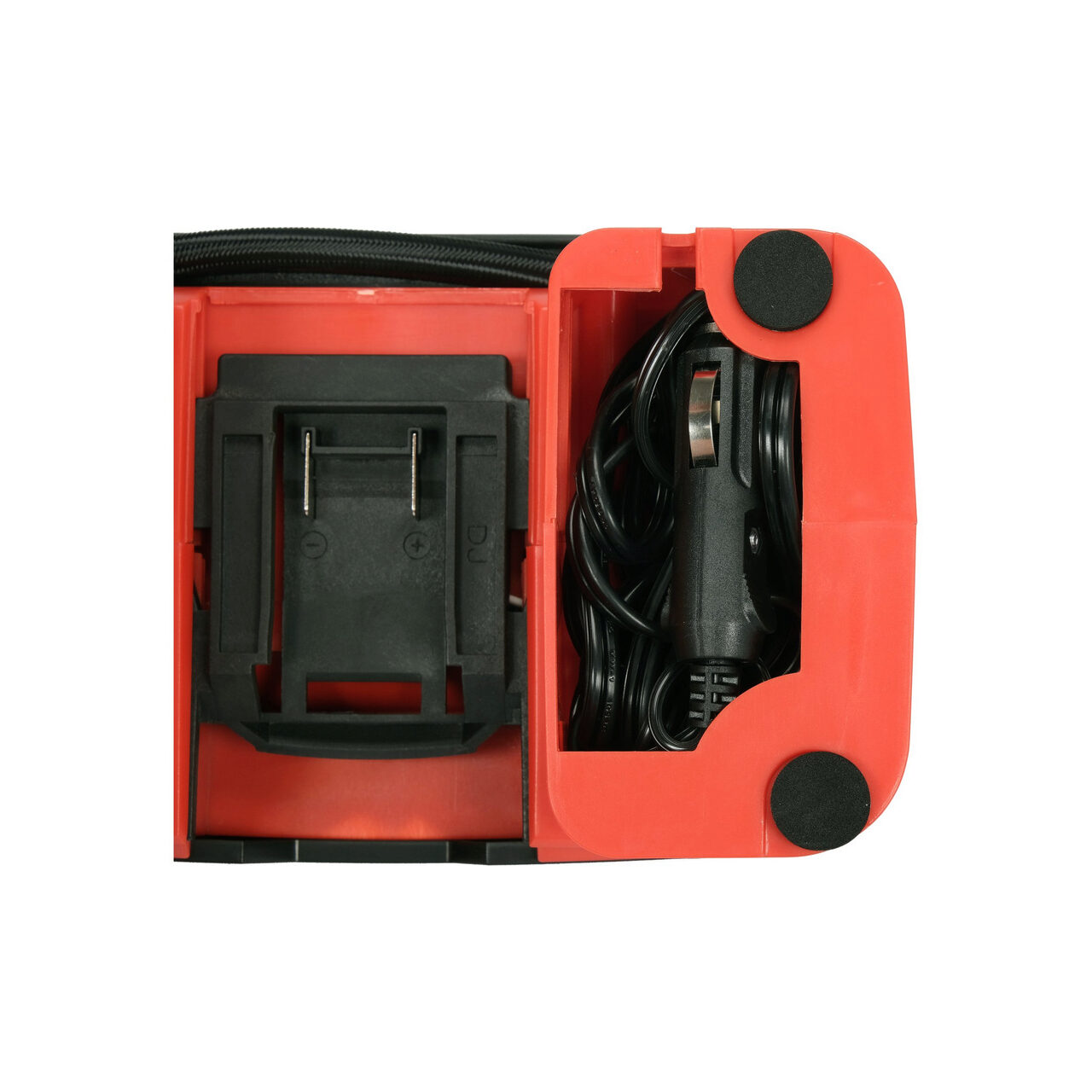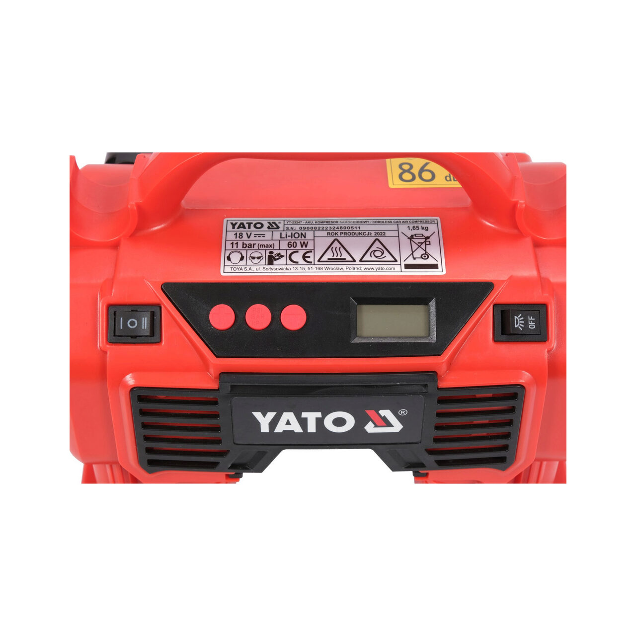 Compresor compact alimentat de o baterie YATO de 18 V și curent de la priza de brichetă de 12 V. Set cu o baterie de 3 Ah.