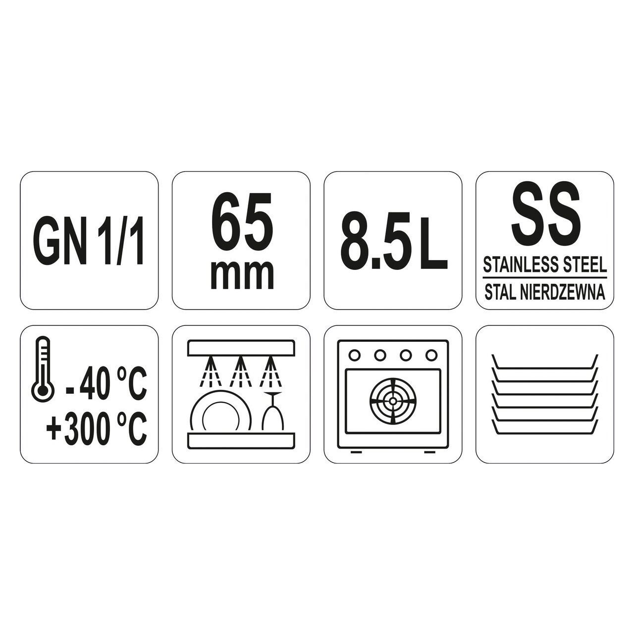 Recipient profesional YATO GN din oțel inoxidabil, GN 1/1, 65 mm , capacitate 8,5 l.