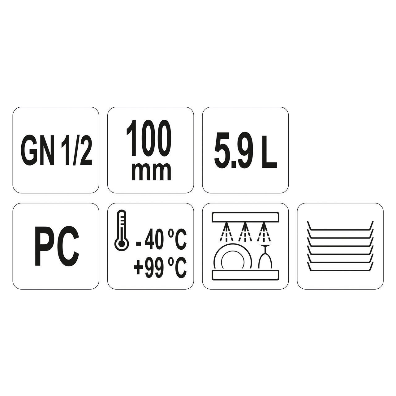 Caracteristici produsRecipient profesional GN de la YATO fabricat din policarbonat, dimensiuni GN 1/2 100 mm și o capacitate de 5,9 l.
