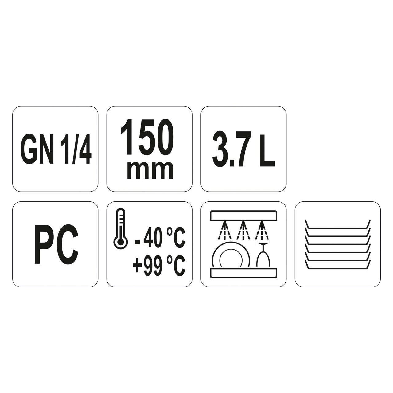 Caracteristici produsRecipient profesional GN de la YATO fabricat din policarbonat cu dimensiuni de 1/4 150 mm GN și o capacitate de 3,7 l.