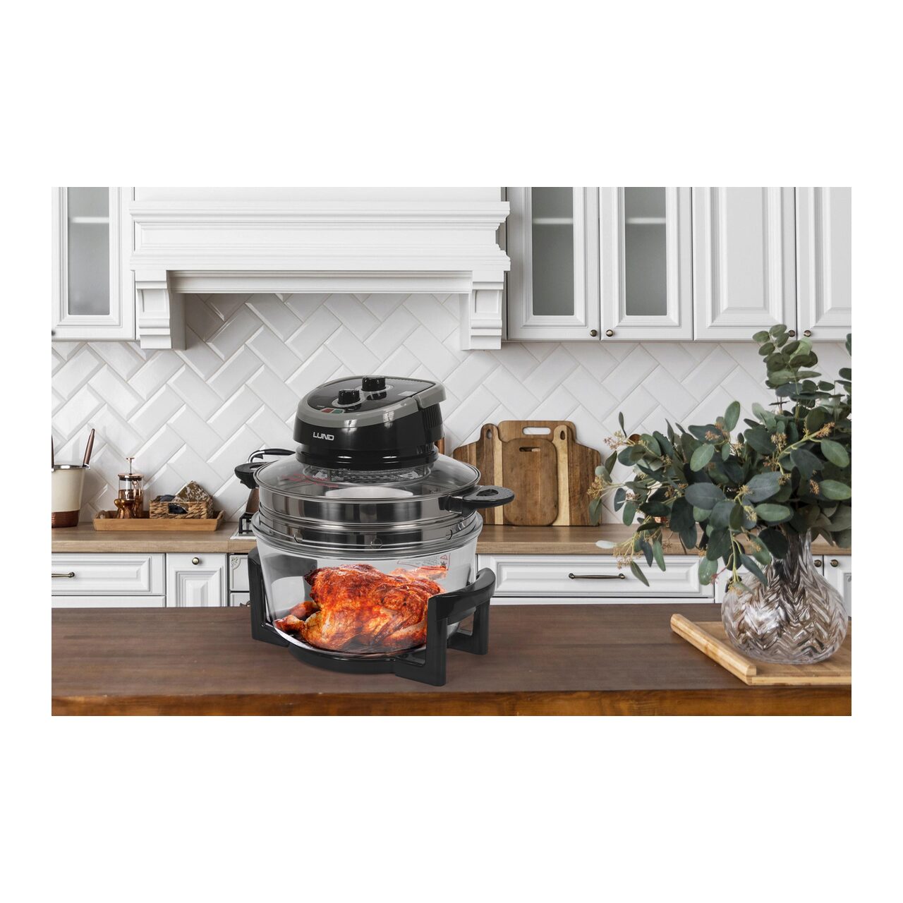 Un aparat multifuncțional care coace, gătește la grătar, prăjește, gătește la abur, dezgheață și încălzește. Datorită utilizării halogenurilor, se coace de câteva ori mai repede în comparație cu un cuptor tradițional. Spre deosebire de alte cuptoare combinate cu halogen disponibile pe piață, acesta are și un inel din oțel inoxidabil cu o grilă pentru prăjit chiar sub sursa de căldură - lampa cu halogen.