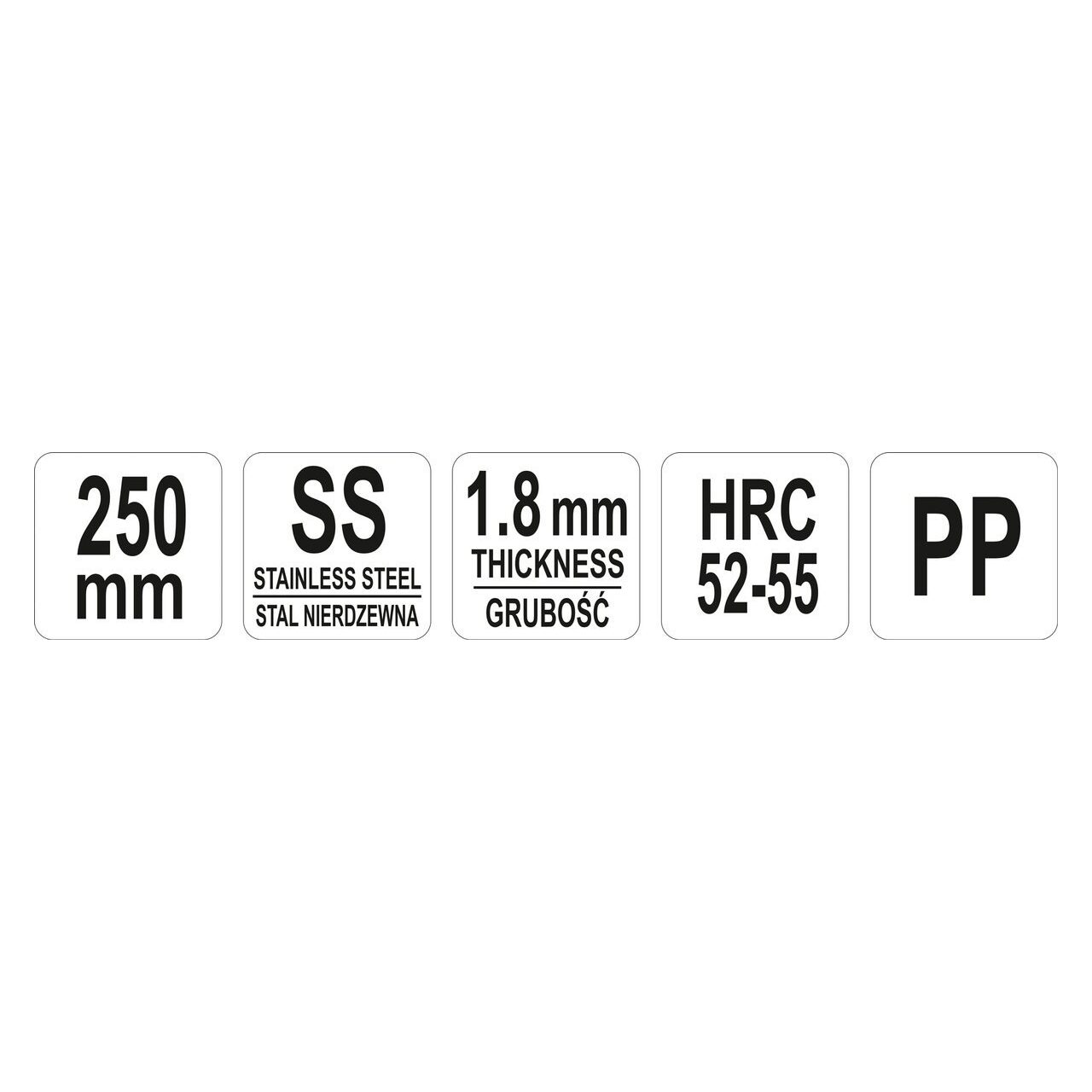 Lama este fabricată din oțel inoxidabil 52-55HRC și are o lungime de 250 mm.