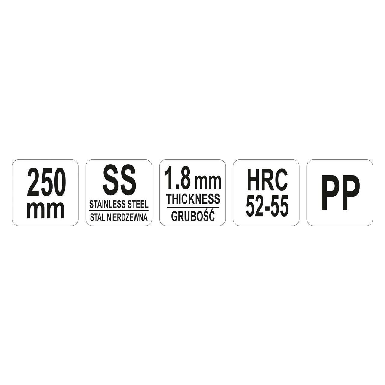 Lama este fabricată din oțel inoxidabil 52-55HRC și are o lungime de 250 mm.
