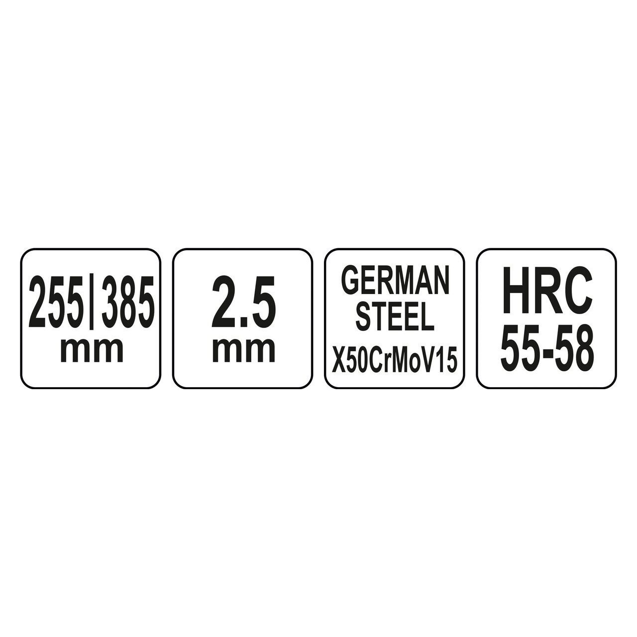 Lungimea totală a cuțitului este de 395 mm, iar lamele de 255 mm.